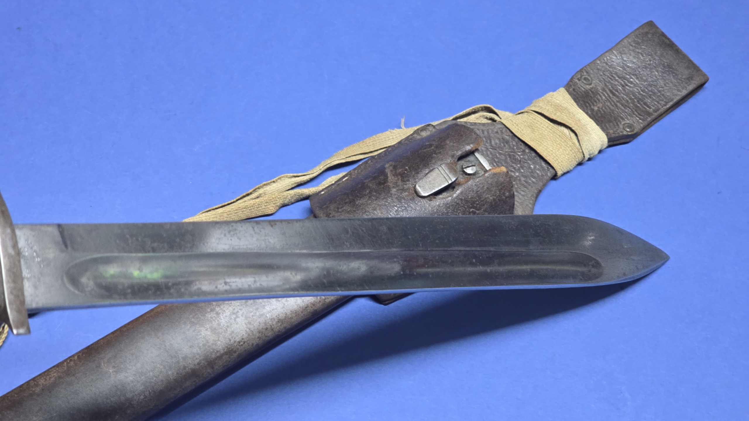 A very attractive early German Model 98/05 bayonet, commonly known as the “Butcher” bayonet, in the desirable high ears configuration. This example is dated 1915 and is complete with a matching wartime leather frog also dated 1915, along with a period troddel. A well-matched WWI set with strong visual appeal and honest service character throughout.