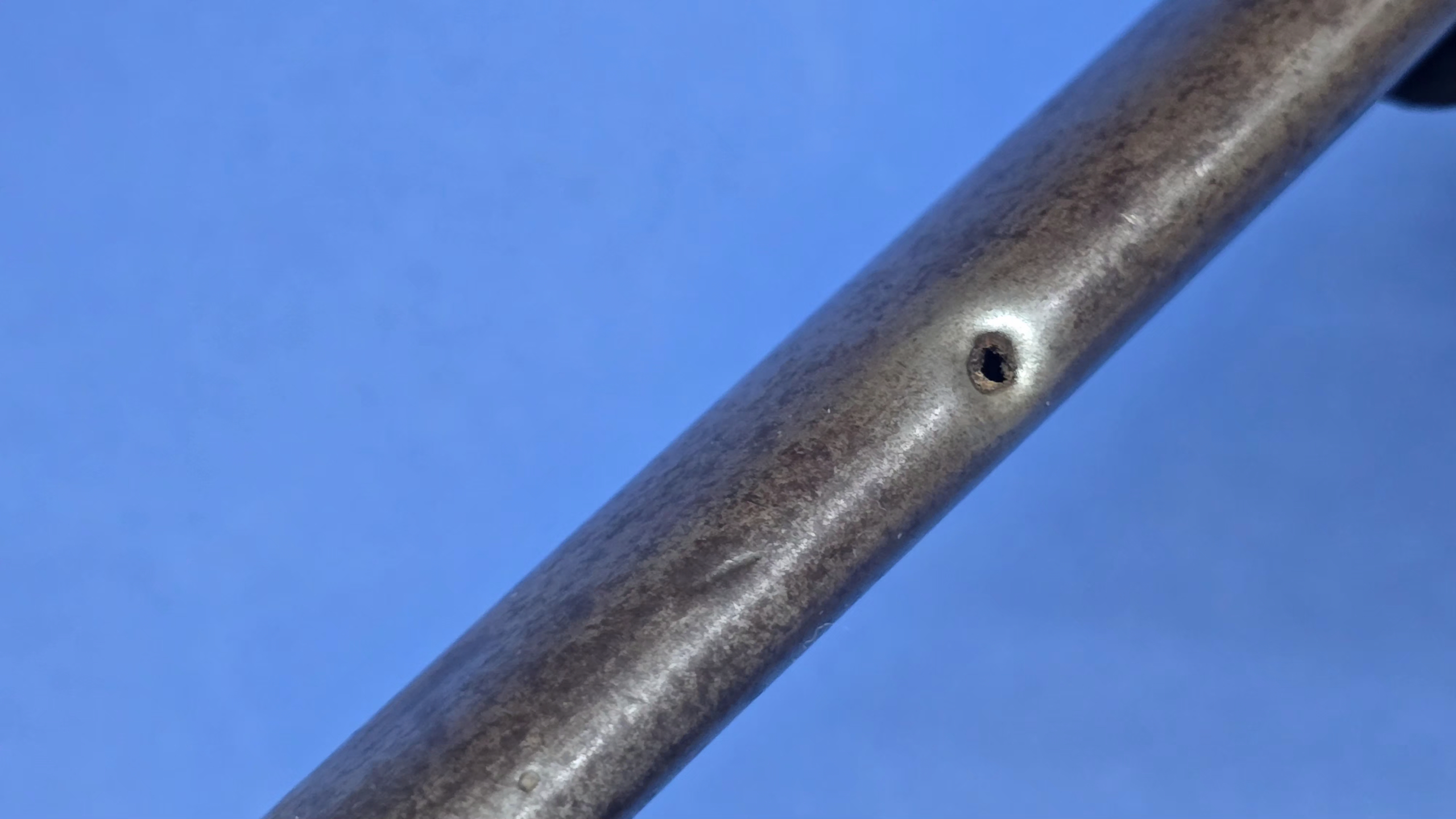 There are a couple of indentations to the rear of the scabbard, which are not severe but should be noted. On the side of the scabbard there is a distinct round puncture consistent with an impact; the exact cause is unknown and is left to the buyer’s interpretation. Overall, the scabbard remains solid and displayable.
