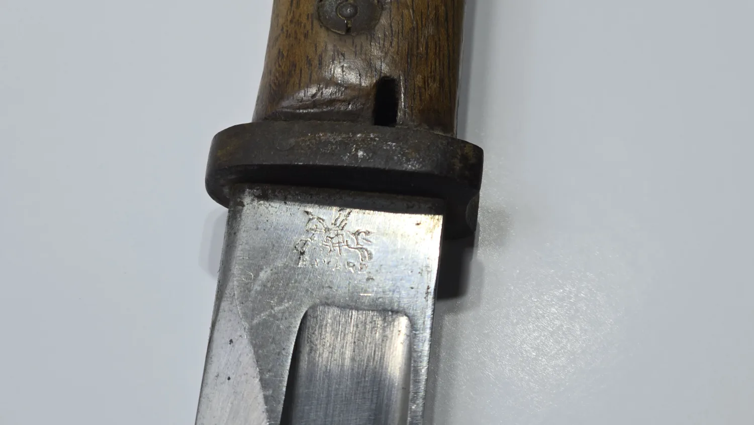 This scarce Imperial S/14 bayonet was manufactured by the Bayard company in Belgium during the German occupation. The blade is in exceptional condition-bright, clean and ending in a sharp tip. The ricasso bears the Bayard logo, depicting a “charging knight on horse back,” while the spine is also proof stamped.