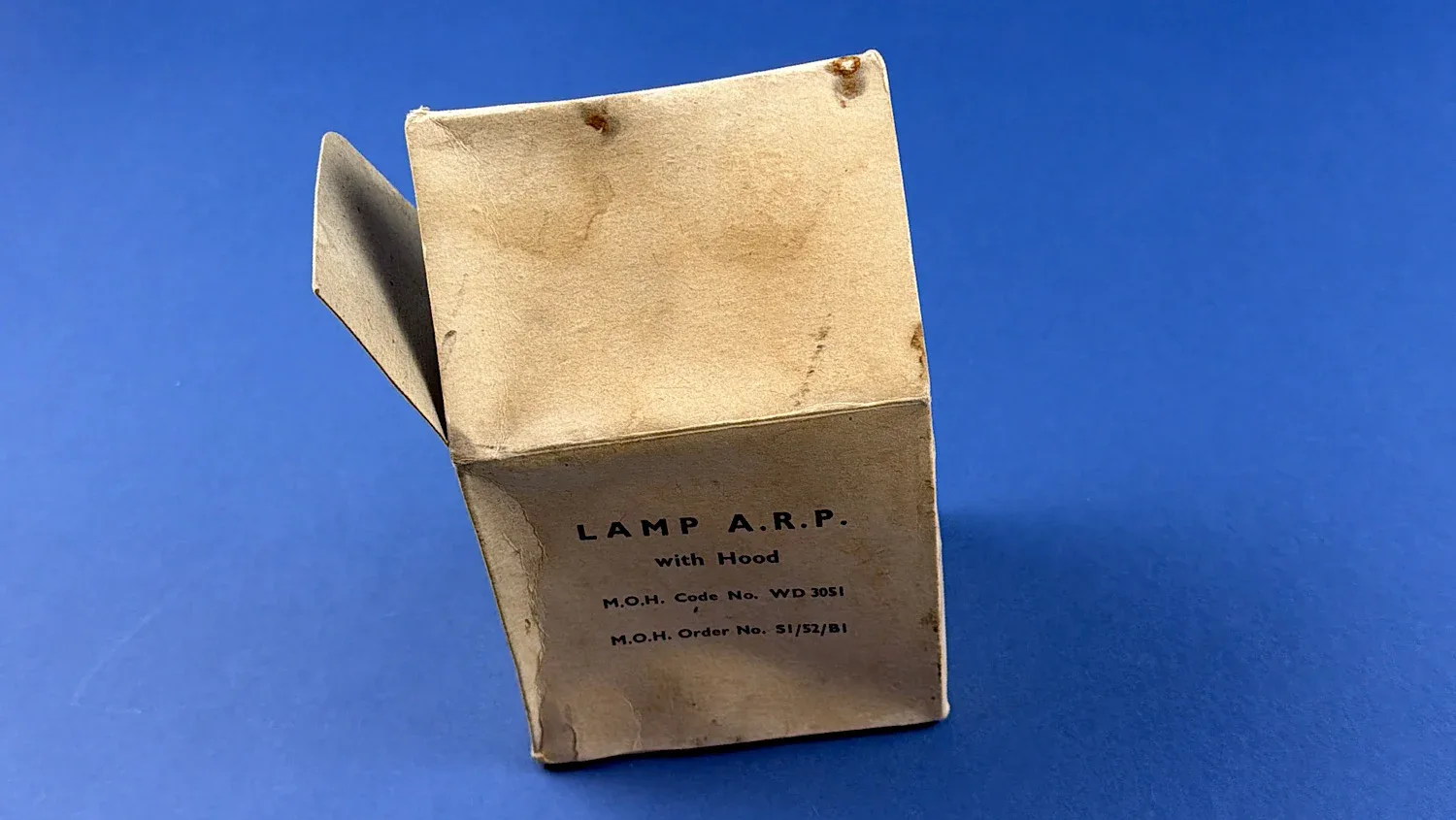 What really elevates this piece is the survival of its original box. Clearly printed “Lamp A.R.P. with Hood” and bearing Ministry of Health codes including WD 3051 and S1/52/B1, it provides fantastic context and makes this a far more desirable collector’s item. Boxed examples are increasingly difficult to find, particularly with matching contents.