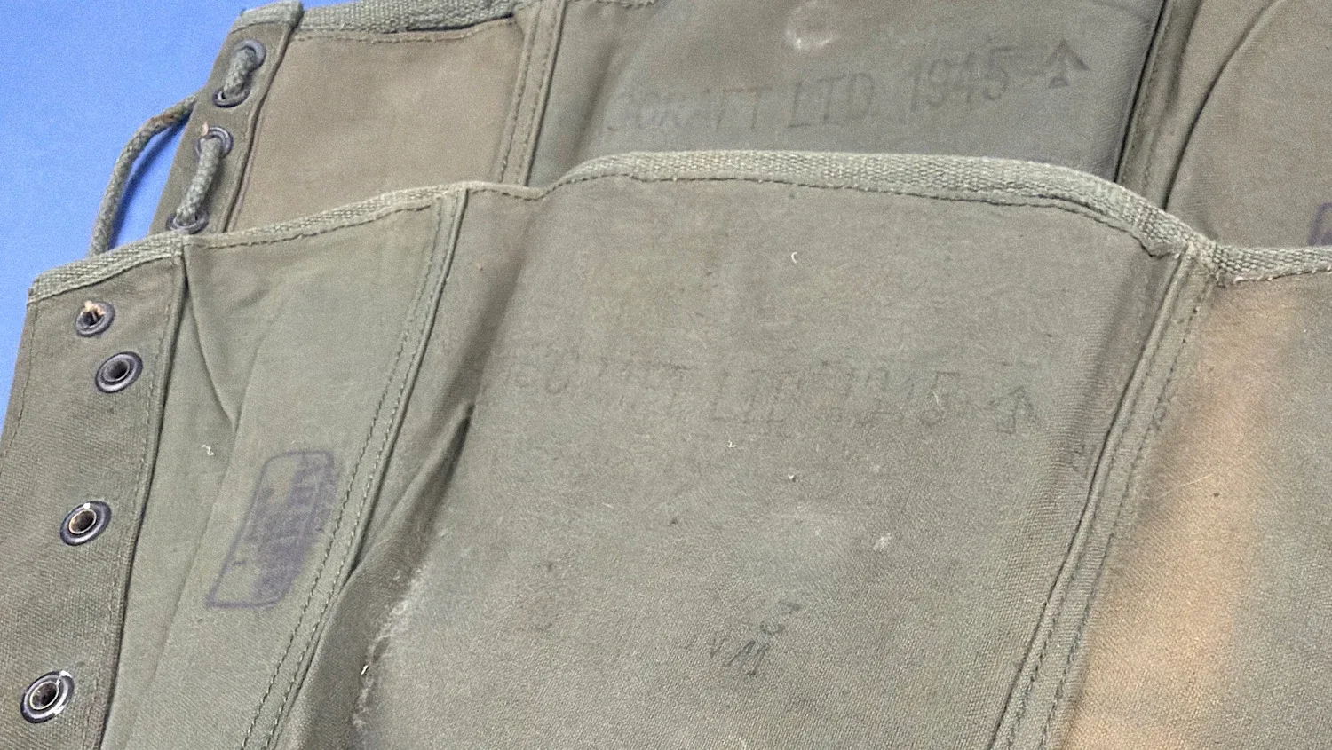 Both gaiters are stamped BAGCRAFT Ltd 1945, confirming late-war production, and also display the British broad arrow marking, denoting official government issue. The presence of a clear maker, date, and issue mark adds to their desirability, particularly for collectors seeking well-marked and identifiable wartime equipment.