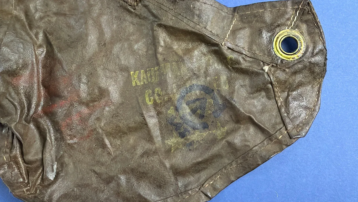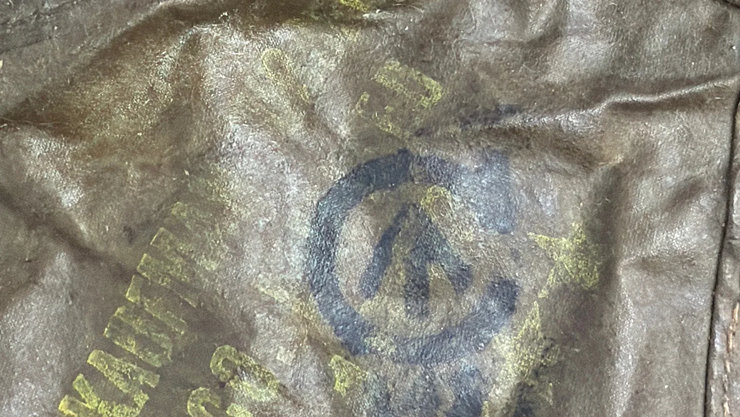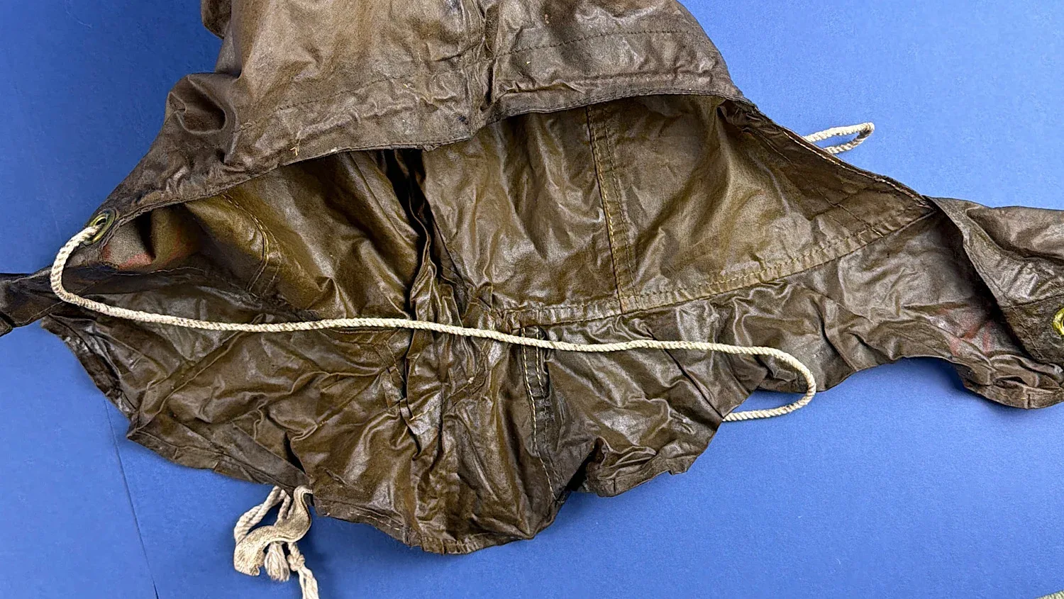 Condition is typical for rubberised wartime material. The fabric shows creasing, surface wear and age-related stiffening. There is at least one visible tear to the lower section, along with general storage wear and surface marking. It remains suitable for display and if displayed on a hat stand of mannequin head it will look excellent. There are markings on the inside, one of which being the Broad Arrow but unfortunately, the rest I can’t make out.