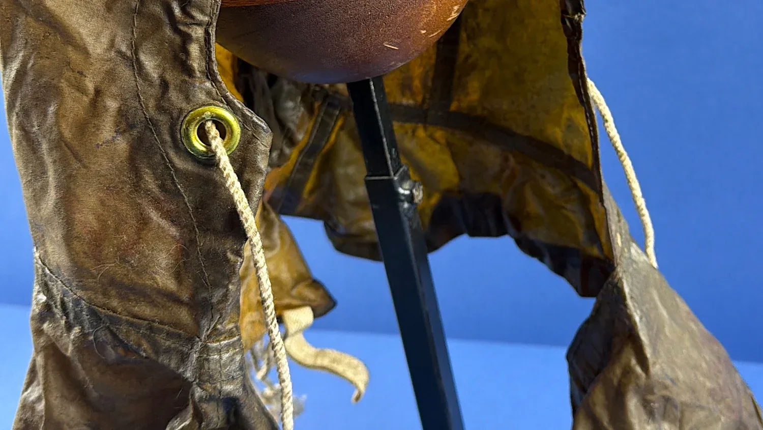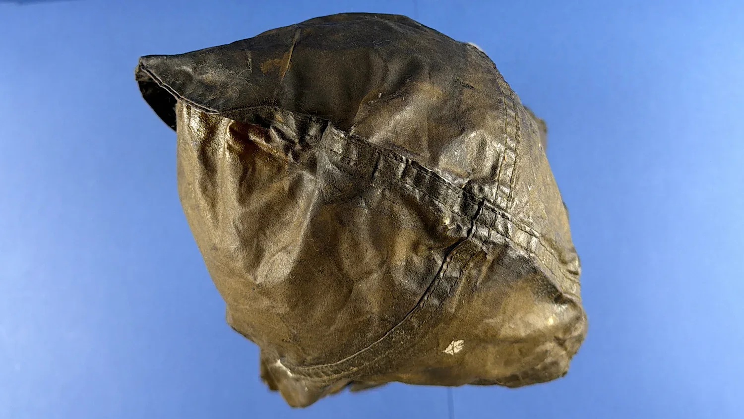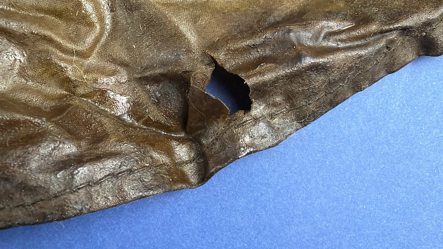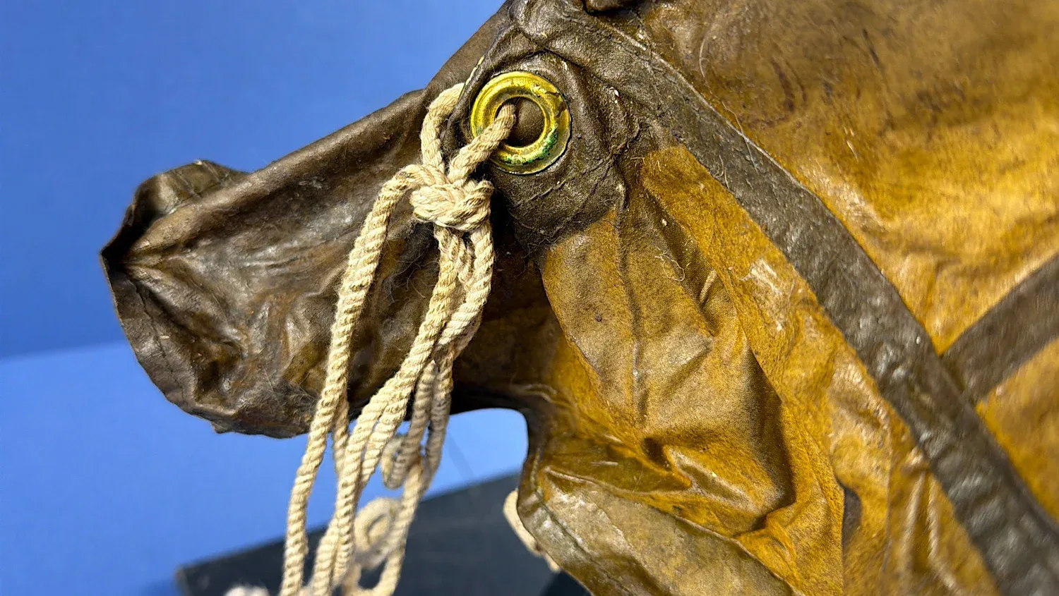 Condition is typical for rubberised wartime material. The fabric shows creasing, surface wear and age-related stiffening. There is at least one visible tear to the lower section, along with general storage wear and surface marking. It remains suitable for display and if displayed on a hat stand of mannequin head it will look excellent. There are markings on the inside, one of which being the Broad Arrow but unfortunately, the rest I can’t make out.