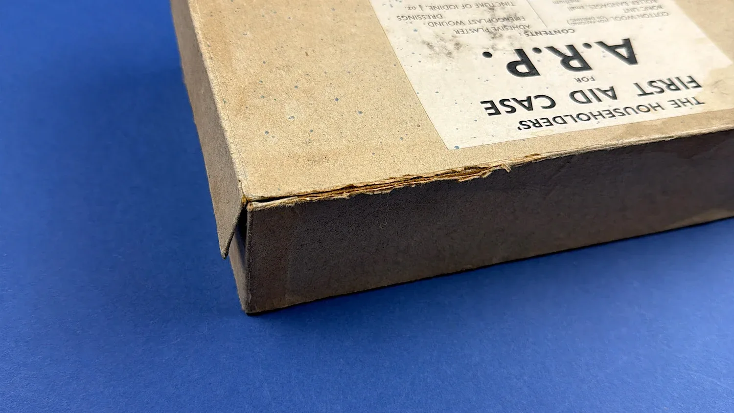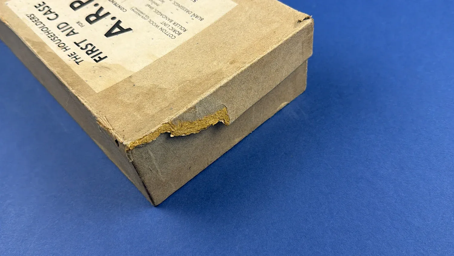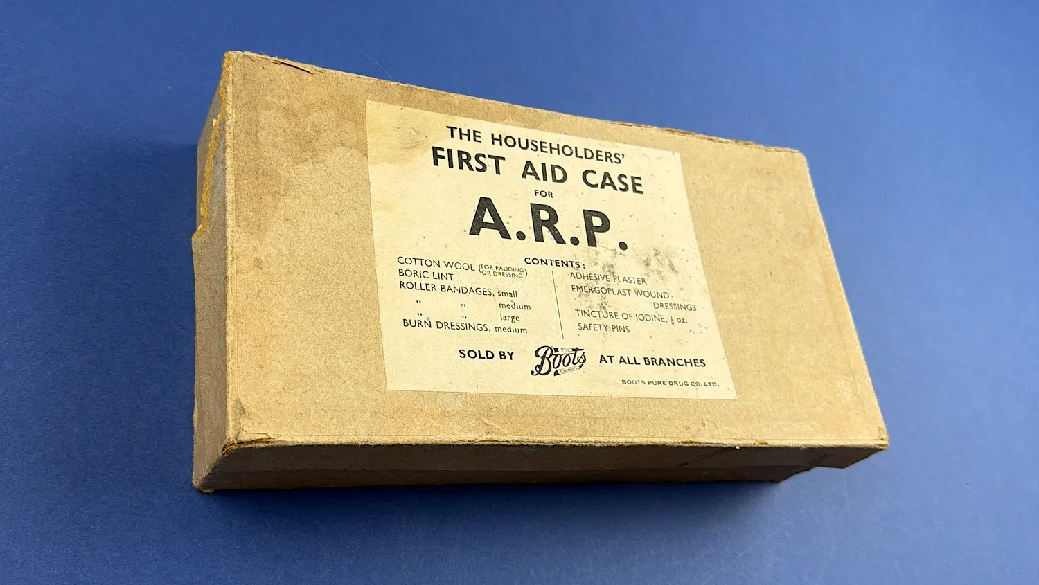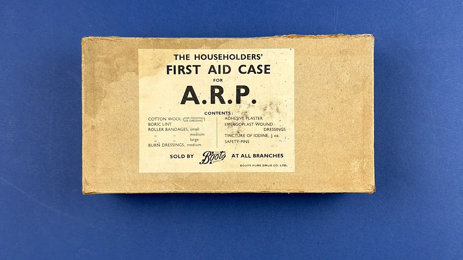 This is an original WW2 British ARP “Householders’ First Aid Case”, a civilian-issued emergency medical kit sold through Boots and intended for use on the Home Front during air raids.