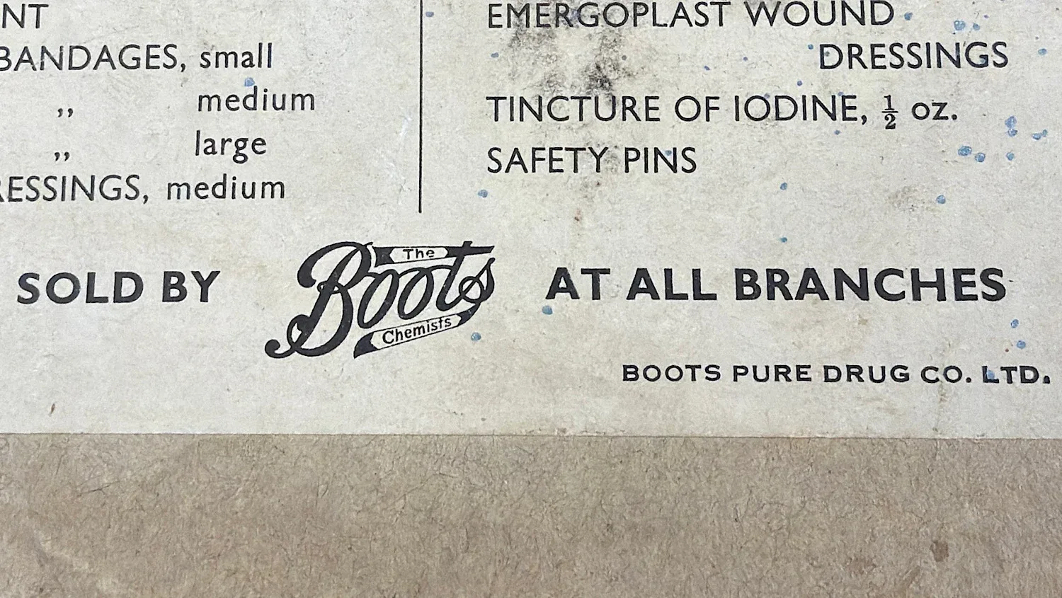 The original paper label to the lid is clearly printed and remains well preserved, detailing the contents and bearing the Boots Chemists name. Inside the lid is the printed “Air Raid Precautions First Aid Case” instruction sheet, reprinted from the official Home Office booklet. This is a particularly desirable feature, as these sheets are often missing and provide a direct link to official wartime guidance issued to civilians.