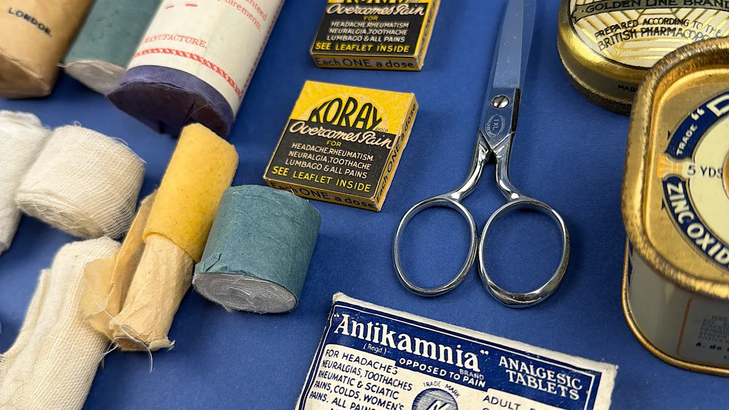Designed to provide immediate treatment in the aftermath of bombing raids, kits such as this were kept in homes, workplaces, and shelters across Britain. They were intended for use before professional medical assistance could be reached, and the contents reflect the types of injuries expected during air raid conditions, including burns, wounds, and shock.