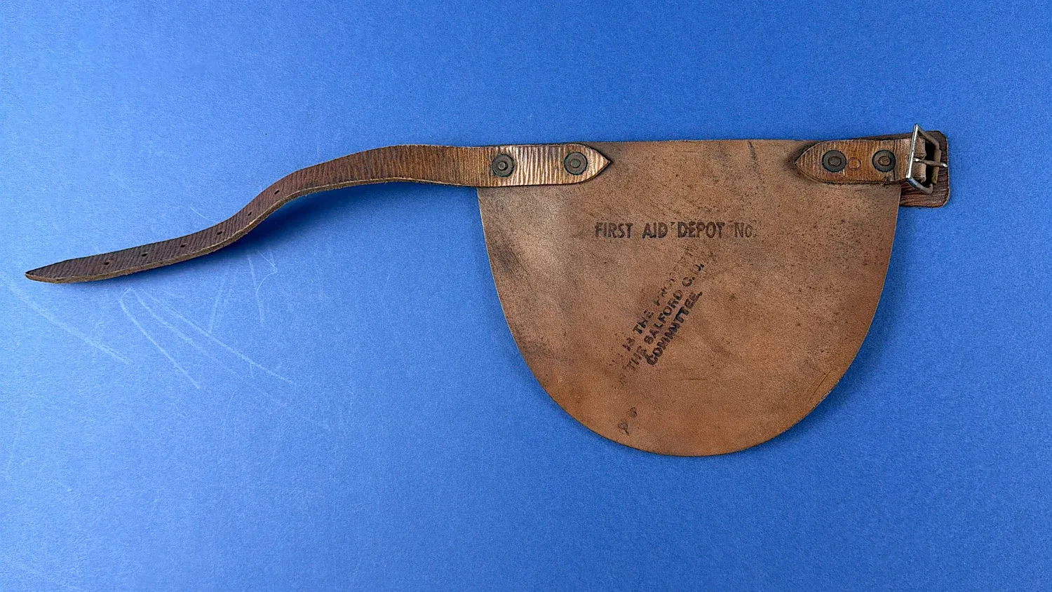 Constructed from thick, shaped leather with an adjustable strap and buckle fastening, this protective pad was designed to be worn by ARP stretcher bearers and casualty service personnel while working in bomb-damaged streets and buildings. Rescue work during the Blitz frequently required kneeling on broken masonry, shattered glass, and unstable debris, making protective equipment such as this both practical and essential.