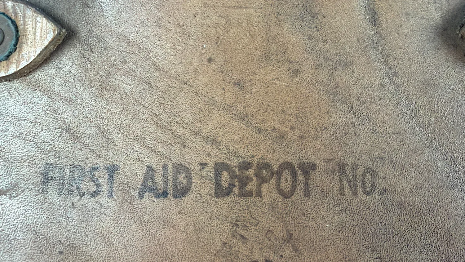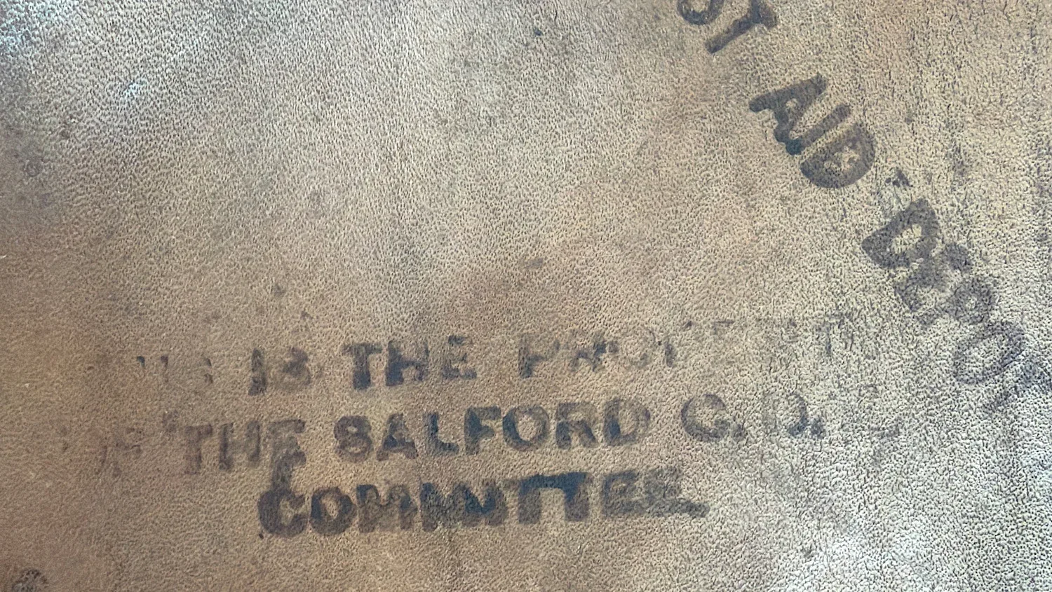The face is stamped “FIRST AID DEPOT No.” along with “ISSUE THE PROPERTY OF THE SALFORD C.D.E. COMMITTEE,” firmly identifying it as municipal Civil Defence issue. Salford, adjoining Manchester, was heavily industrial and suffered bombing during the war, placing this piece squarely within the operational reality of the northern Home Front. The marking “A.G. 1941” confirms wartime manufacture at the height of the Blitz period.