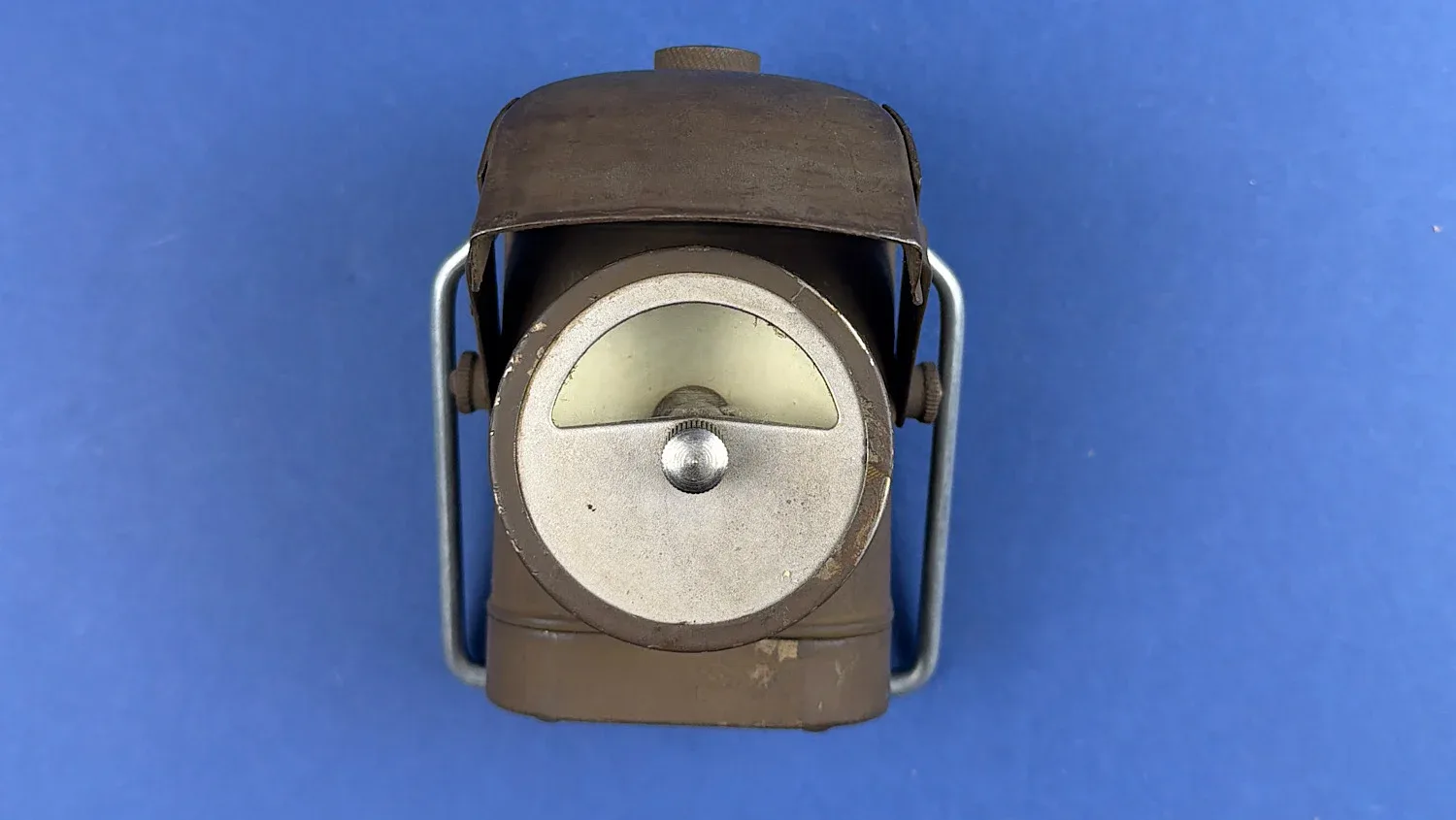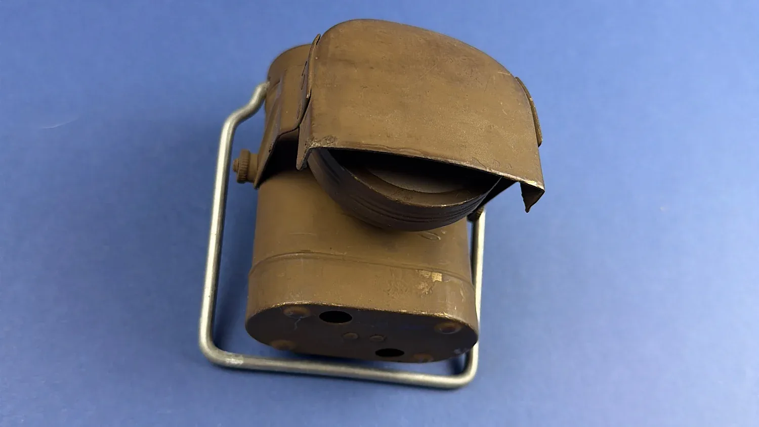These compact electric lamps were designed as portable work lights, intended for use in workshops, maintenance areas, and by technical personnel requiring directed illumination in confined or poorly lit spaces. The design features a cylindrical steel body finished in wartime brown paint, with a pivoting hood that allows the beam to be directed downward onto a work surface.