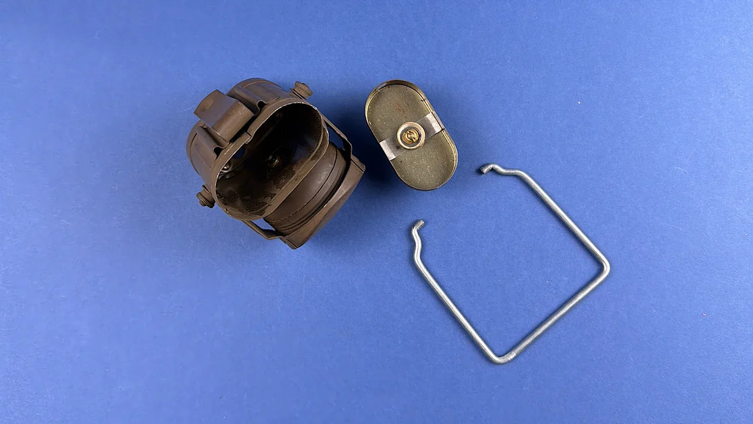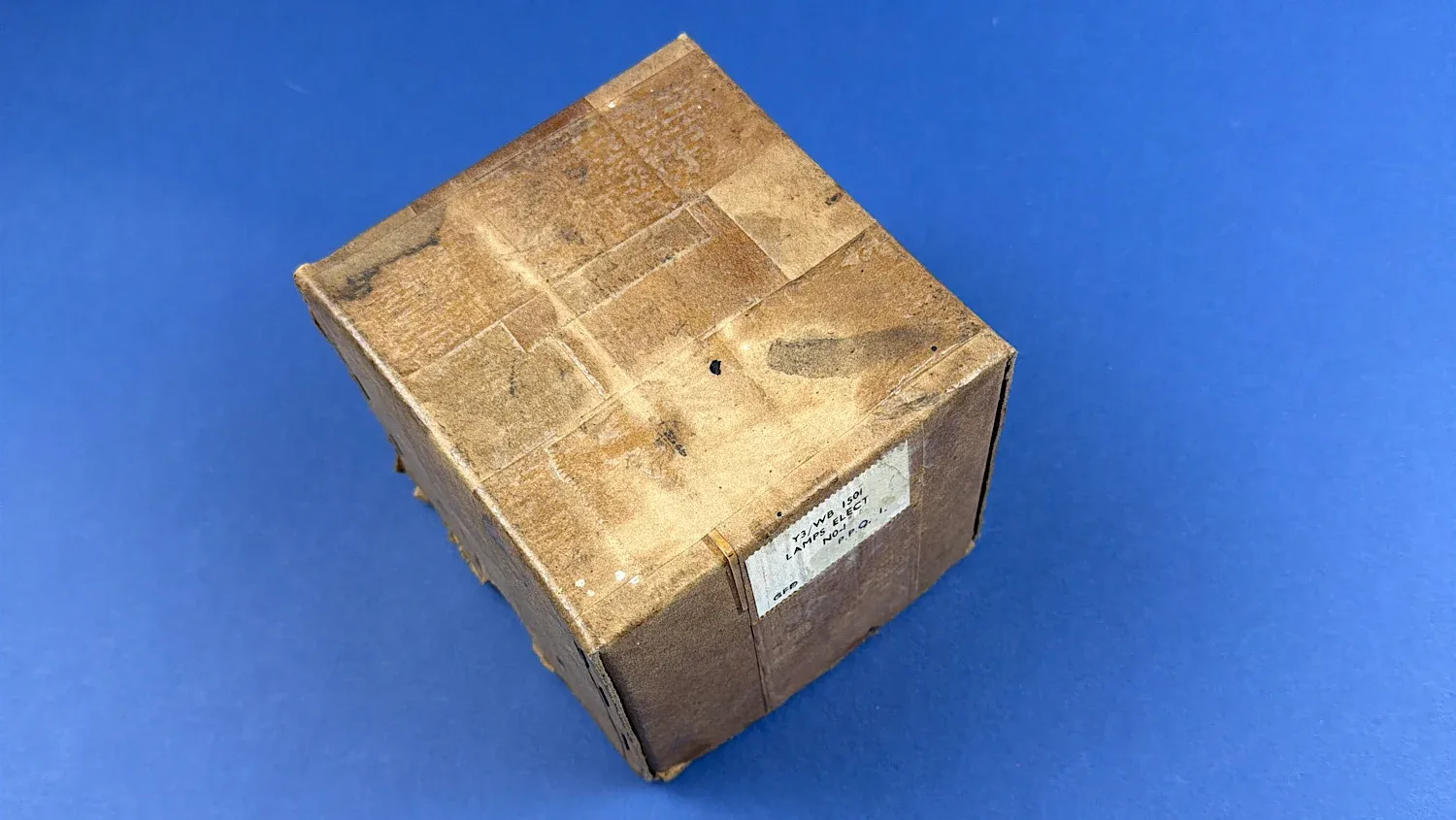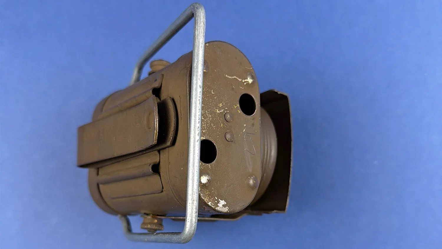 Condition is good overall. The lamp retains its original wartime brown paint with honest signs of use and minor paint loss. The internal components appear complete. The cardboard storage box survives but shows heavy wear, age-related deterioration and repairs from long storage. The original issue tag is still present and remains clearly readable.