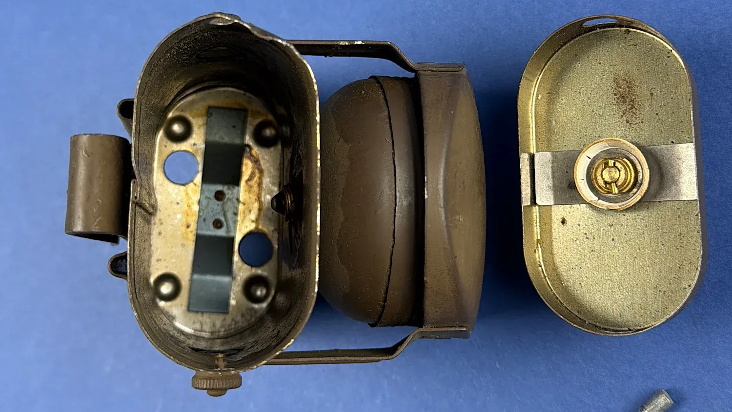 The body is clearly stamped “Lamp Electric (N.Y.) Ltd”, confirming wartime production by the British manufacturer Lamp Electric of New York Road, Leeds. This firm produced a variety of electrical lighting equipment during the war, including inspection lamps and portable lighting for civil defence and industrial use.