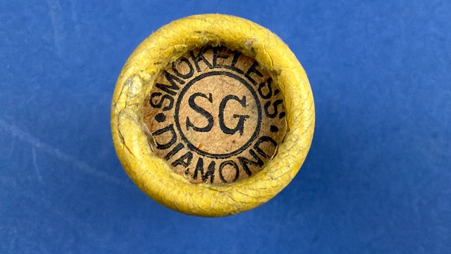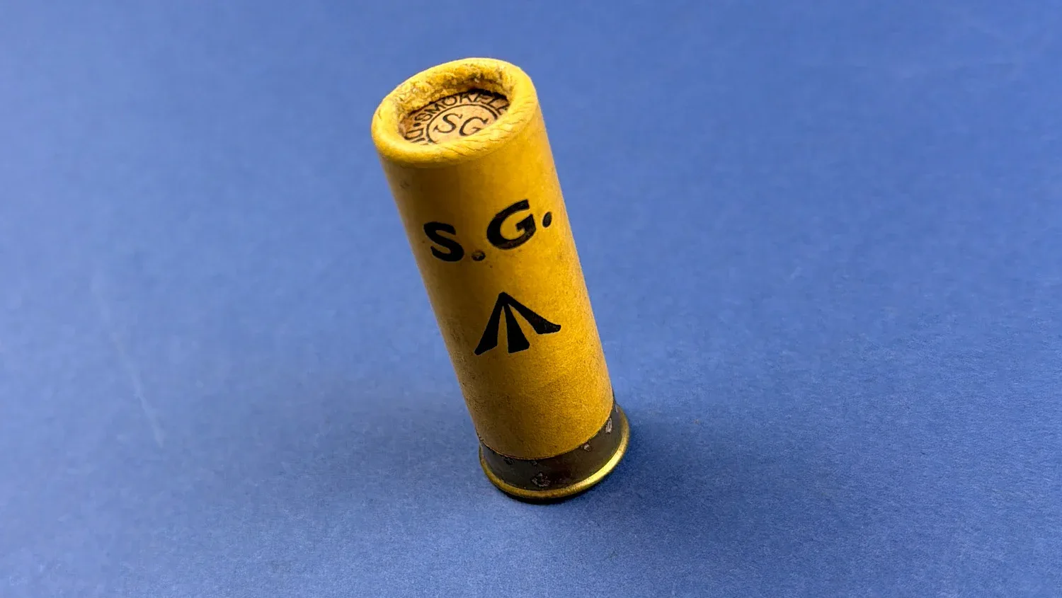 This is an original WW2 British 12 Bore S.G. cartridge manufactured by Eley Kynoch Ltd, retaining its distinctive yellow paper case and clearly printed “Smokeless Diamond S.G.” top wad.