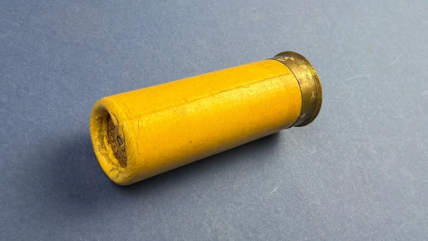 The yellow paper case remains structurally sound with clear printed markings, and the brass head shows honest age-related patina. The top wad remains legible and well defined, making this an attractive and displayable example of wartime British shotgun ammunition.