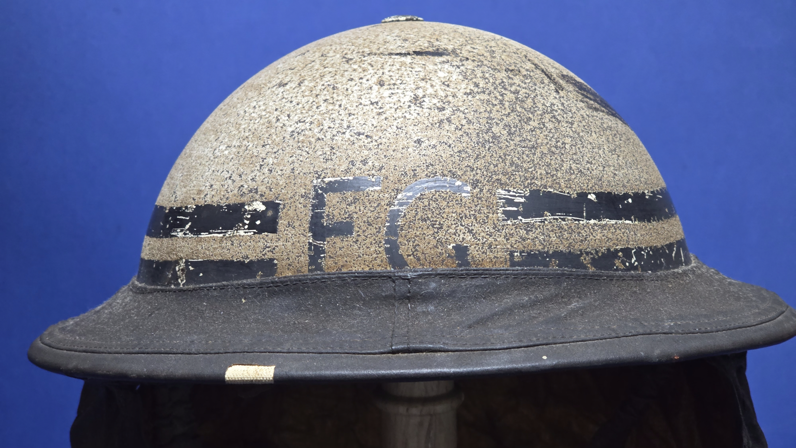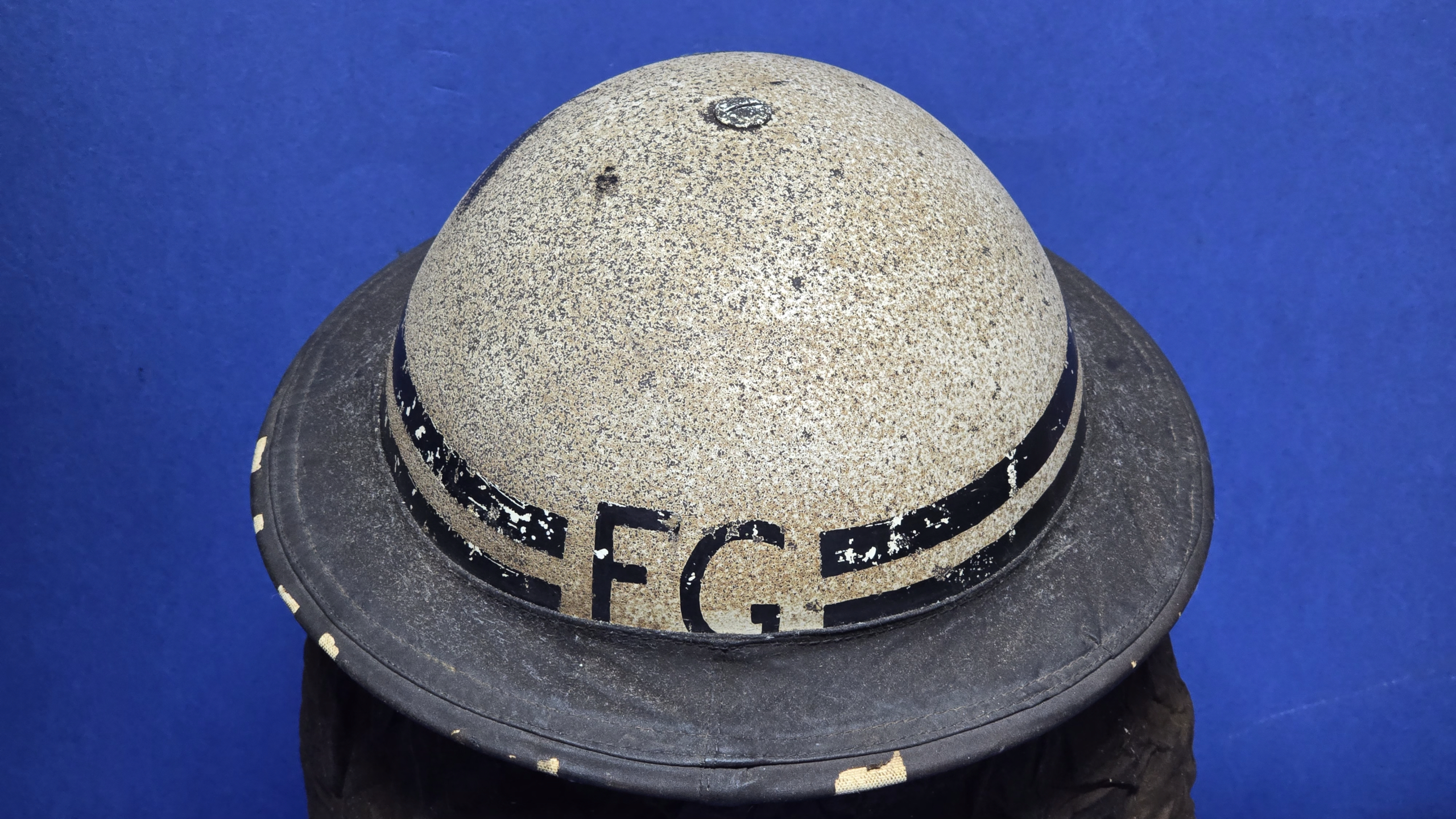 Early Fire Guard helmets frequently followed Civil Defence patterns and were often fitted with anti-gas curtains, despite these later proving ineffective. As discussed in Helmets of the Home Front II, many such items were nonetheless retained in service, making surviving examples with original curtains particularly desirable today. The marking style seen on this helmet is illustrated in the same reference work, providing useful contextual support.