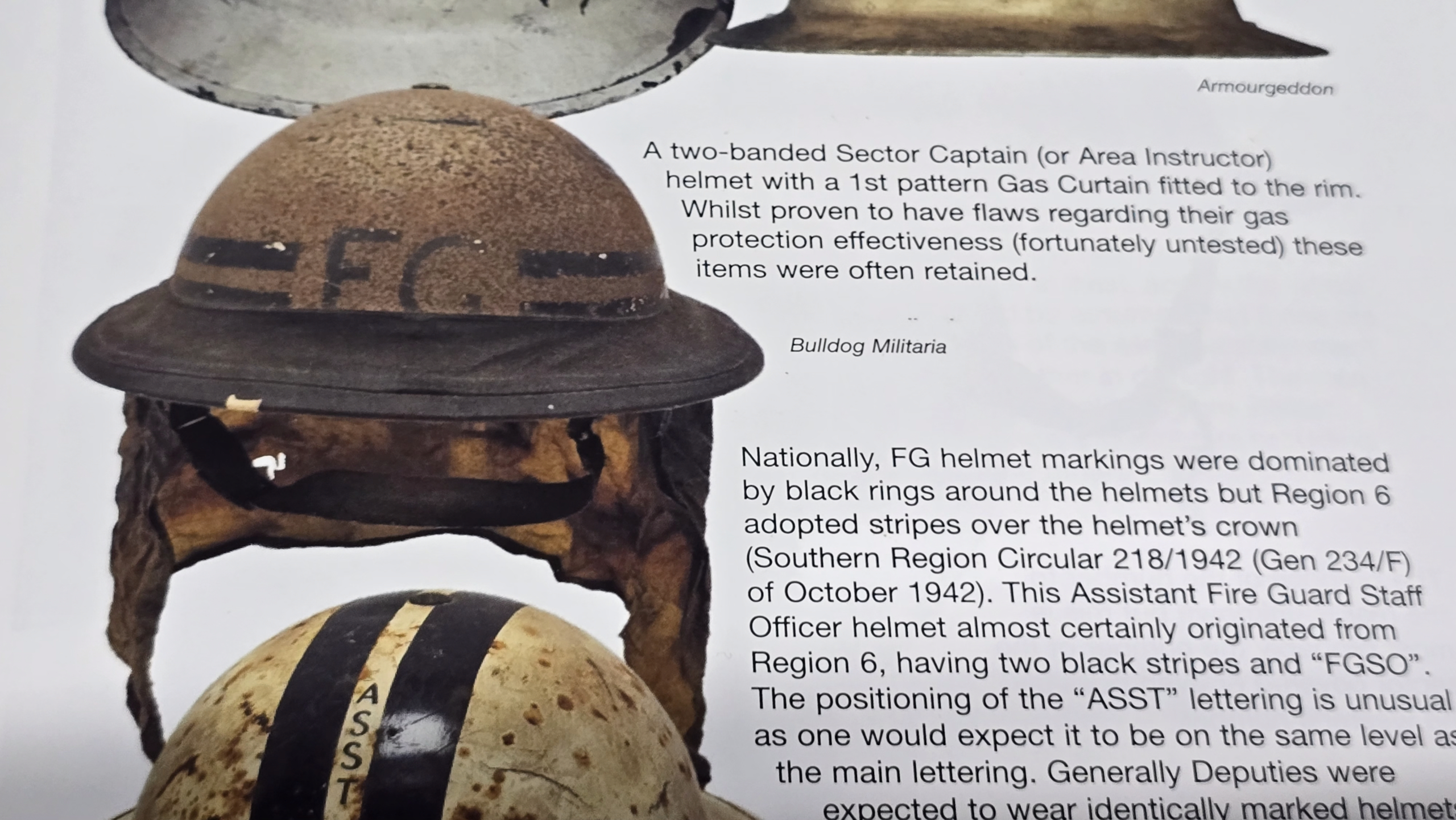 This helmet is the actual illustrated example shown in Helmets of the Home Front II, page 163 by Adrian and George Blake, where it is identified as a two-banded Fire Guard Sector Captain (or Area Instructor) helmet fitted with a first pattern gas curtain. Being a reference-published example from one of the standard works on the subject.