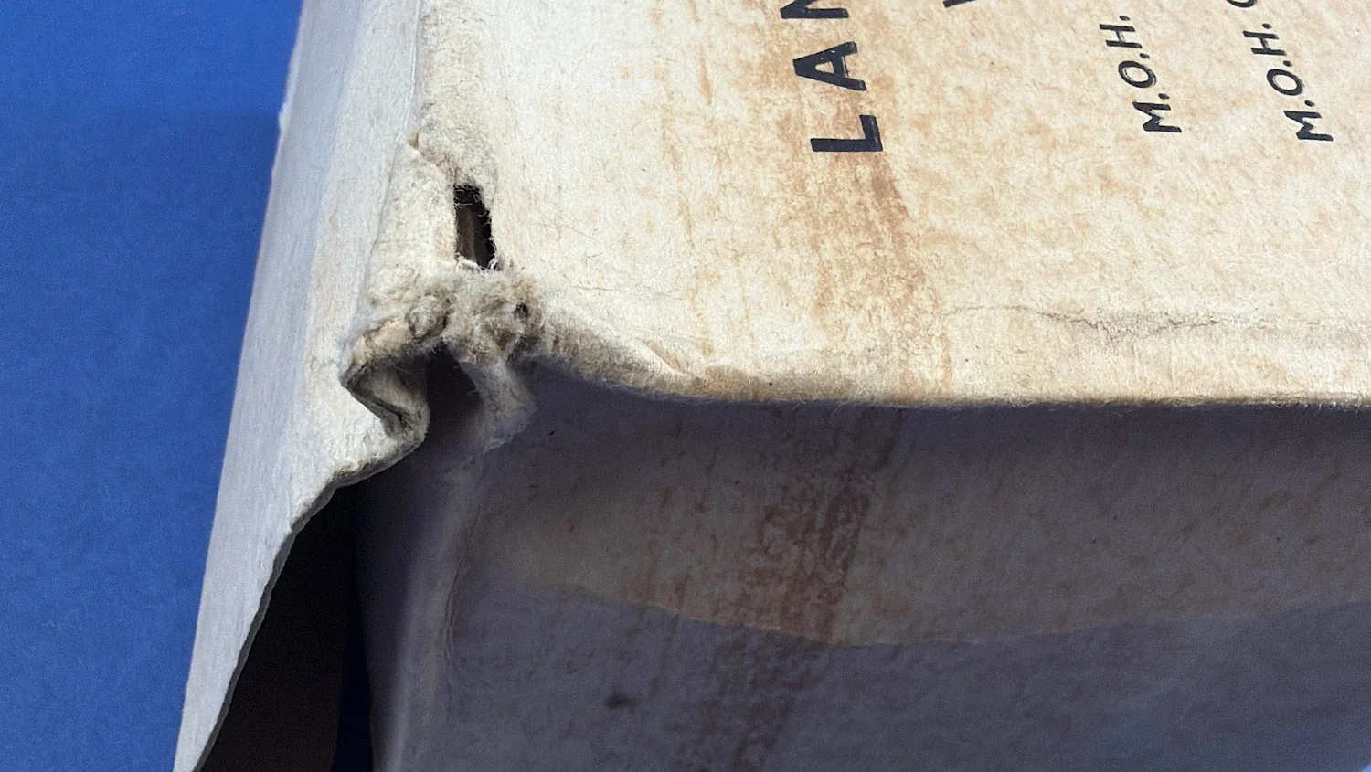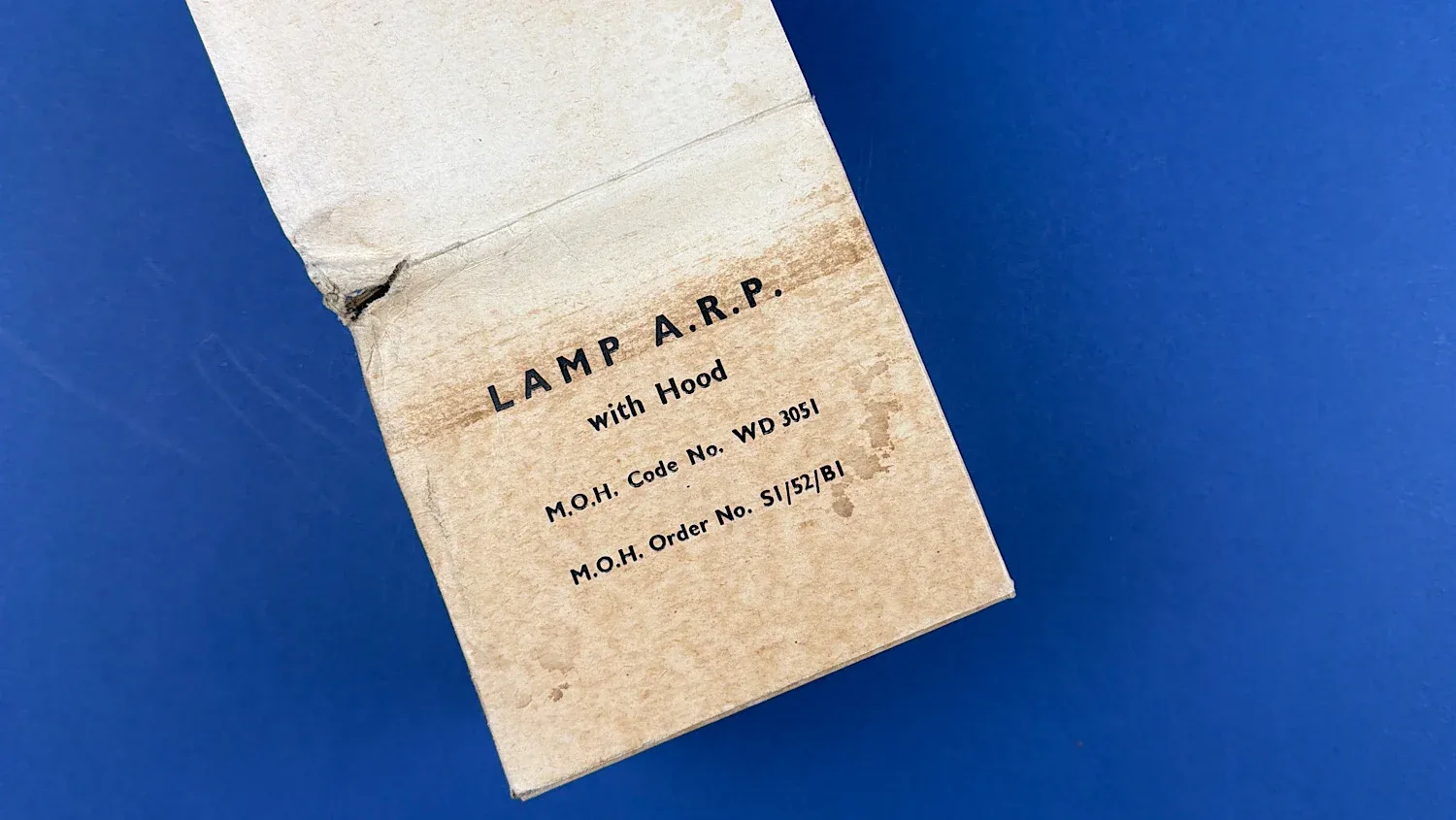 The original box shows honest storage wear, age-related staining and a small tear to one corner of the lid, but remains structurally solid and entirely displayable. Boxed examples are significantly less common than loose lamps and are increasingly sought after by collectors focusing on British Home Front equipment.