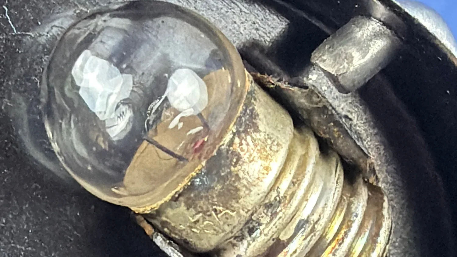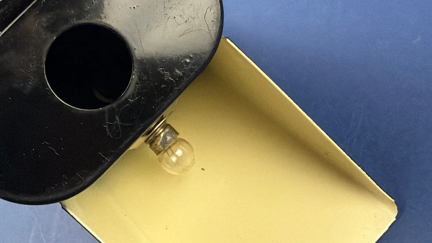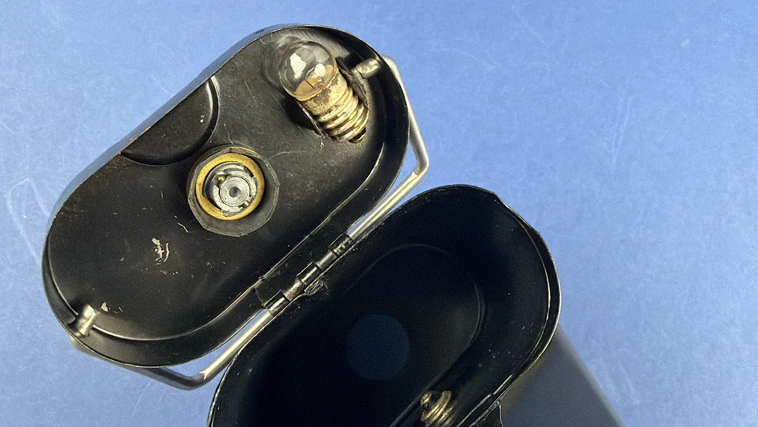 The lamp itself is the correct black bakelite-bodied example with integral hood and wire carry handle. The hinge is sound, the body is free from cracks, and the internal battery compartment remains clean. The original style screw bulb is present, showing appropriate period ageing. The switch and contact areas appear undisturbed.
