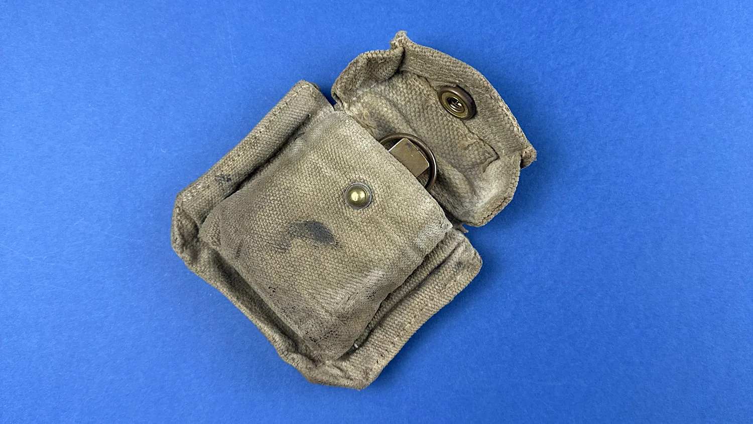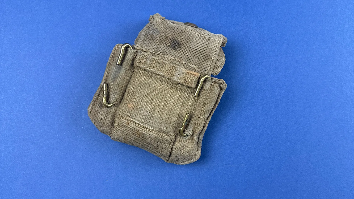 Accompanying the compass is its original wartime webbing pouch, correct for Mk II and Mk III prismatic compasses. Constructed from heavy khaki cotton webbing with period-correct brass fittings and press-stud closure, the pouch displays appropriate age, wear and staining consistent with Home Front service. The compass fits correctly within the pouch, forming a well-matched and authentic set as encountered during the Second World War.