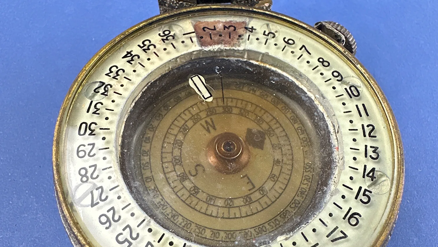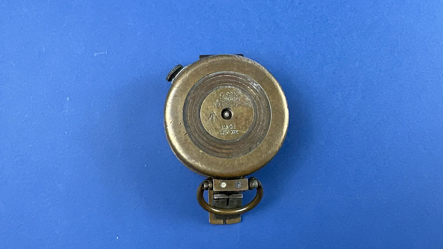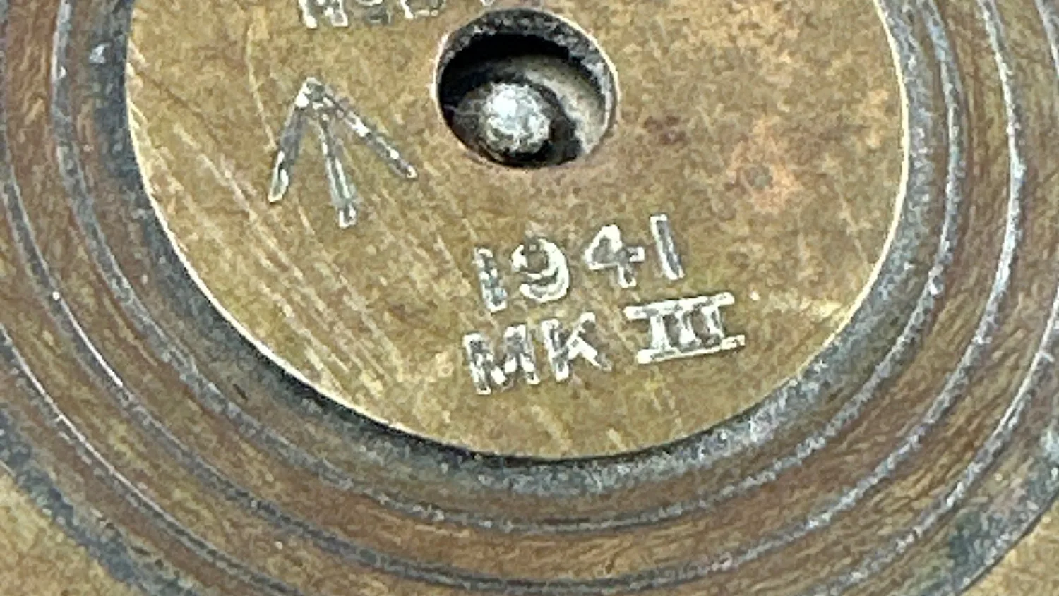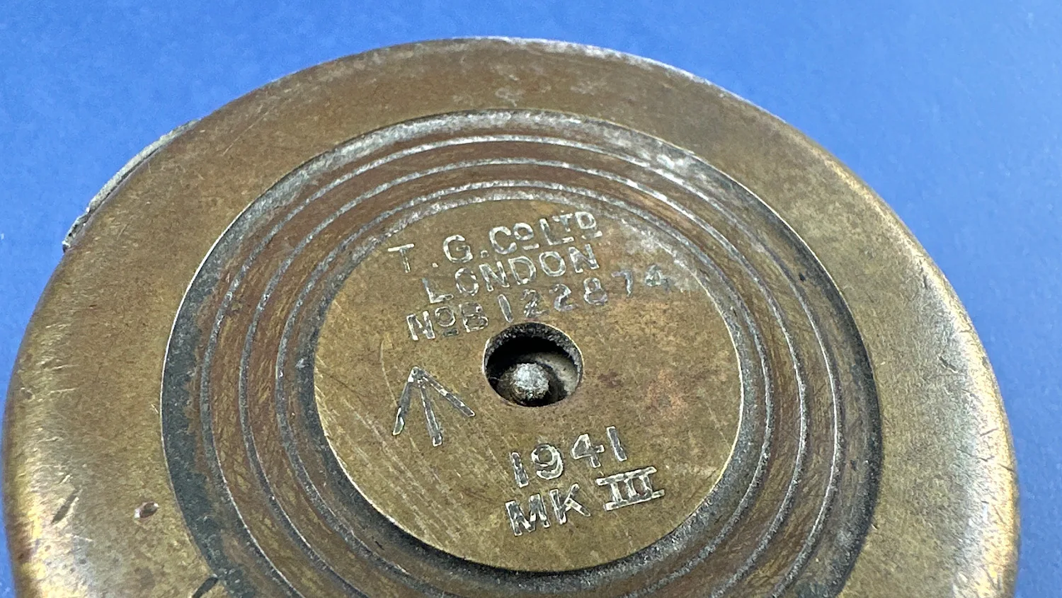 The compass retains its correct brass body with concentric strengthening rings, prismatic sighting system and original enamel degree ring, all consistent with wartime Mk III production. The rear of the casing is clearly marked with the Broad Arrow ownership stamp, the maker’s London marking, and the 1941 date, firmly placing this piece within the critical early-war period. The compass shows the honest signs of service use expected from an original wartime instrument, with natural patination and wear that reflect genuine period handling rather than later refurbishment.