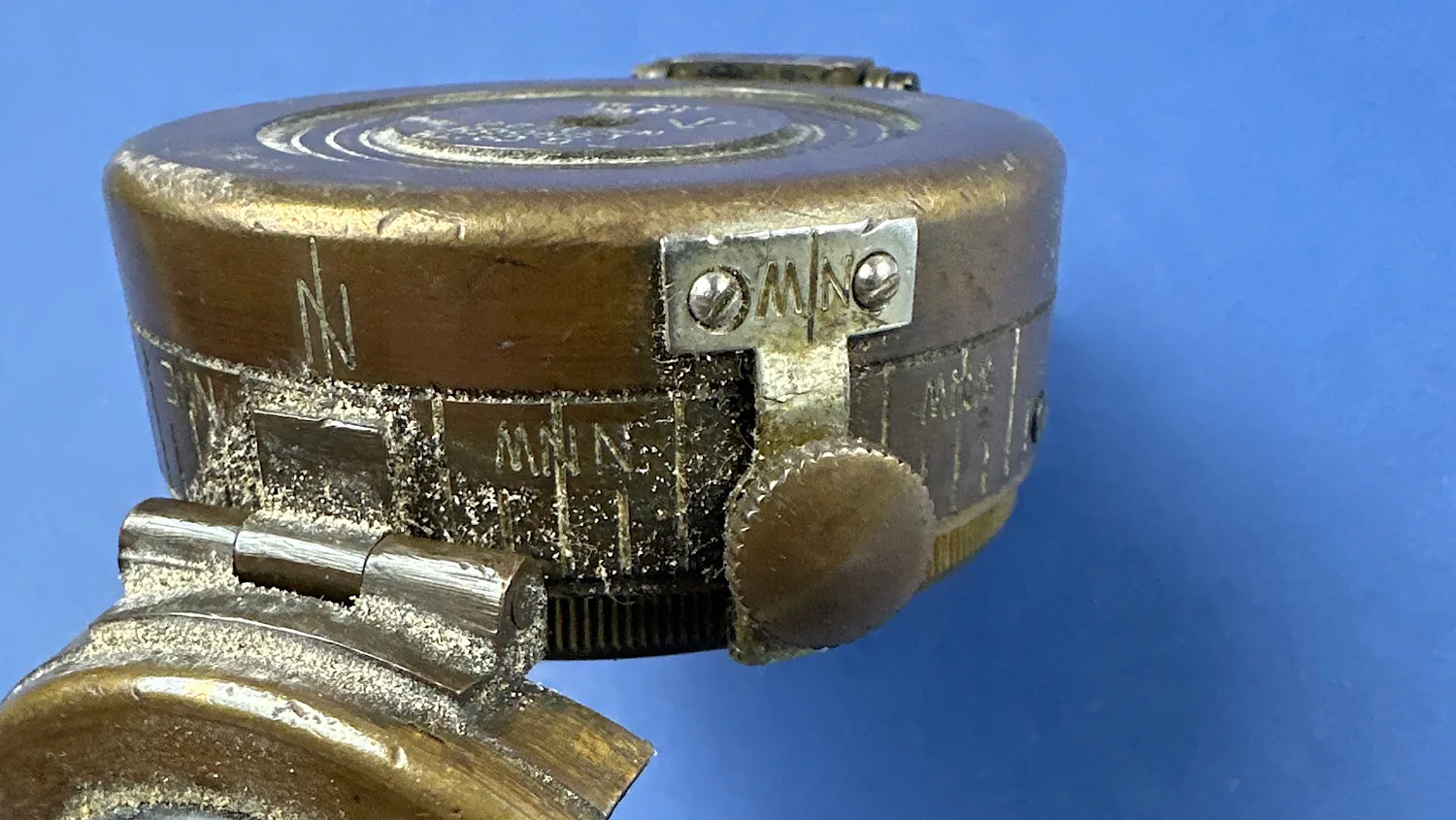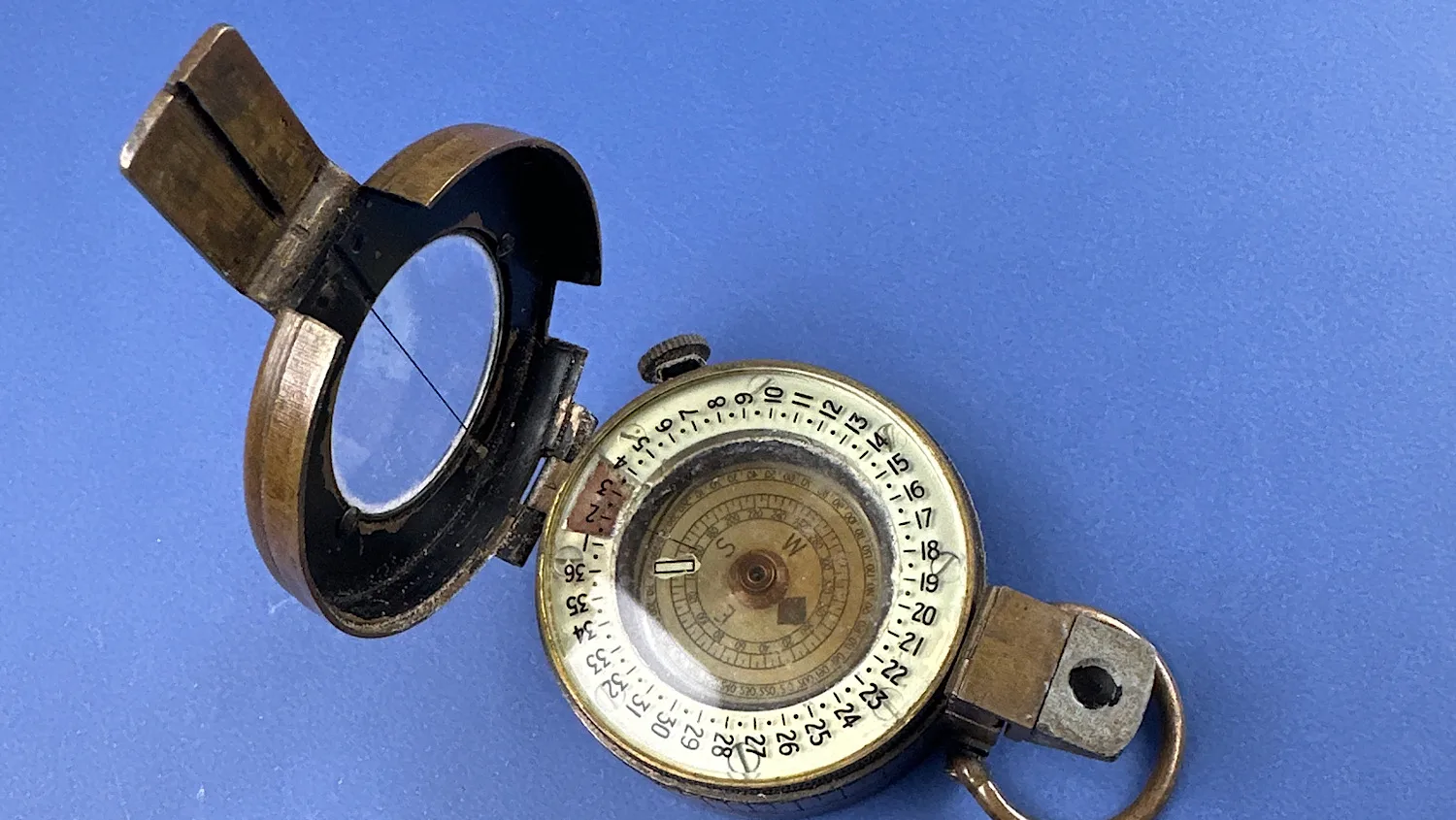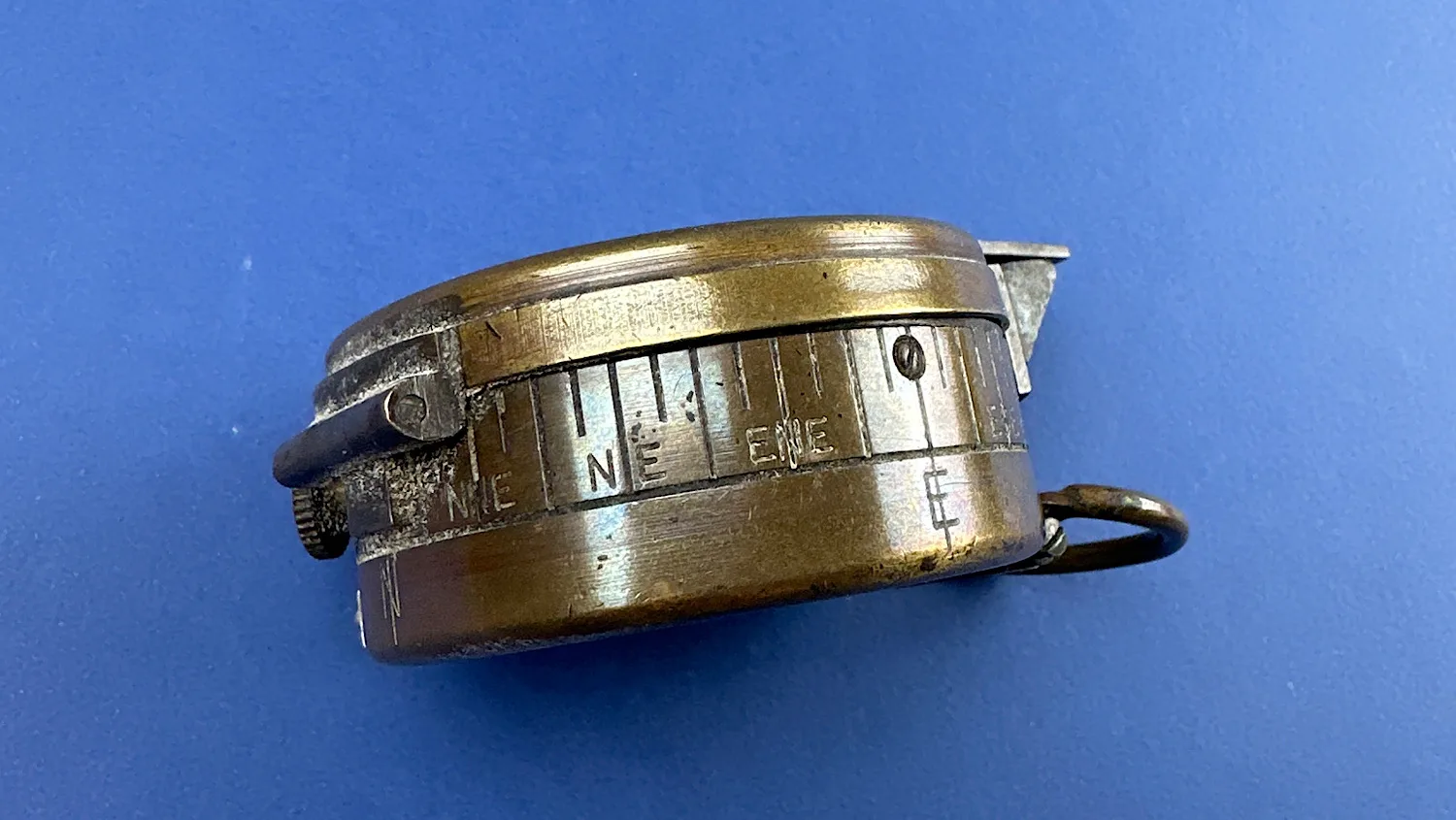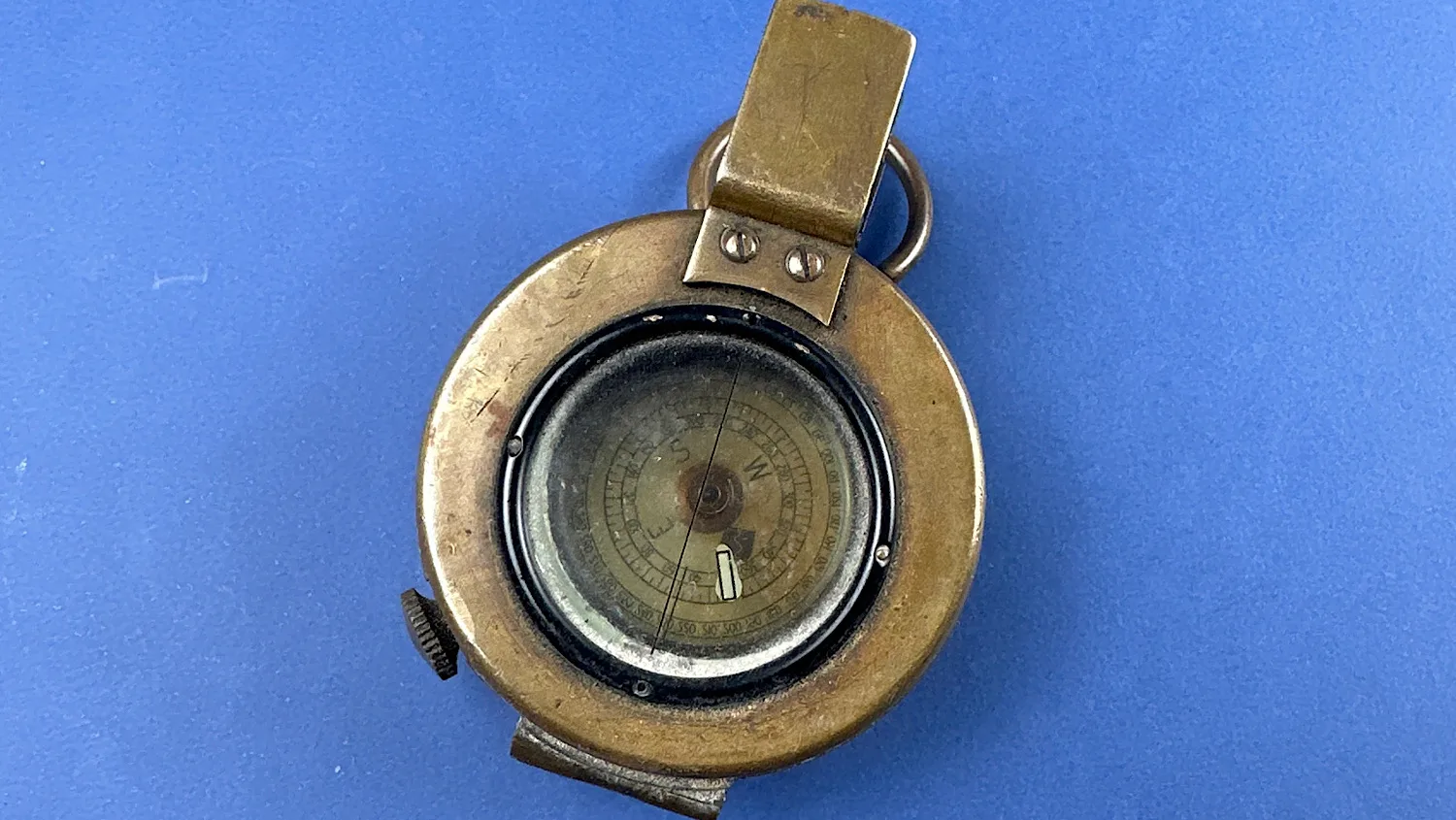 The compass retains its correct brass body with concentric strengthening rings, prismatic sighting system and original enamel degree ring, all consistent with wartime Mk III production. The rear of the casing is clearly marked with the Broad Arrow ownership stamp, the maker’s London marking, and the 1941 date, firmly placing this piece within the critical early-war period. The compass shows the honest signs of service use expected from an original wartime instrument, with natural patination and wear that reflect genuine period handling rather than later refurbishment.