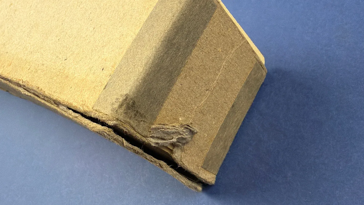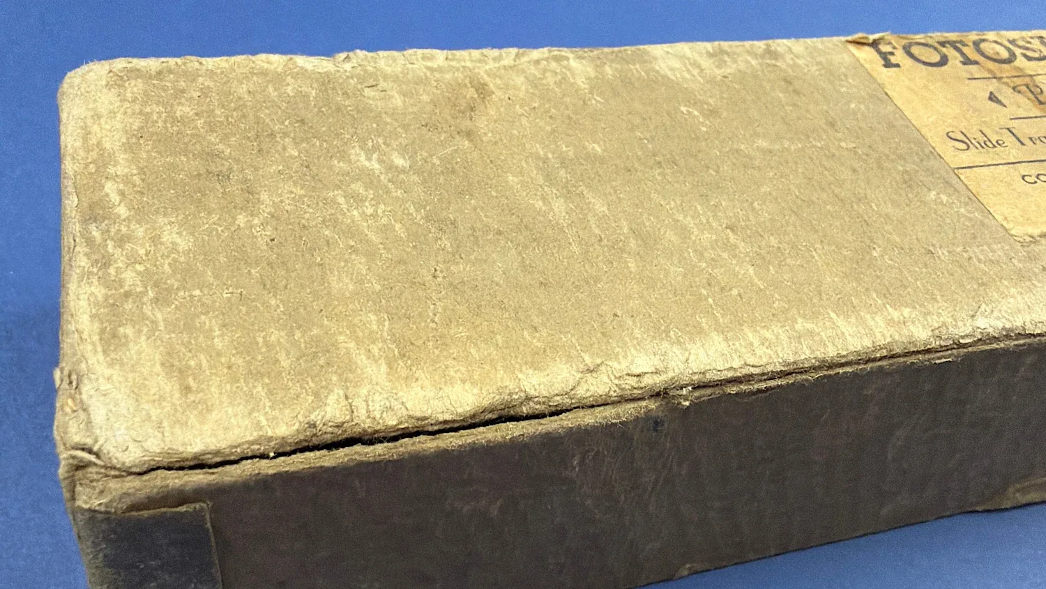 Condition-wise, the box shows clear signs of age and use, including wear and what appear to be period attempts at repair. One end of the lid is missing, and the label has suffered a tear, likely removing information such as a box or set designation. The best way to assess the overall condition is by examining the photographs provided. Importantly, all 186 slides are present and accounted for, having been individually counted, and their individual condition is actually very good. The box tells a story of use, while the slides themselves remain the primary conveyors of information.