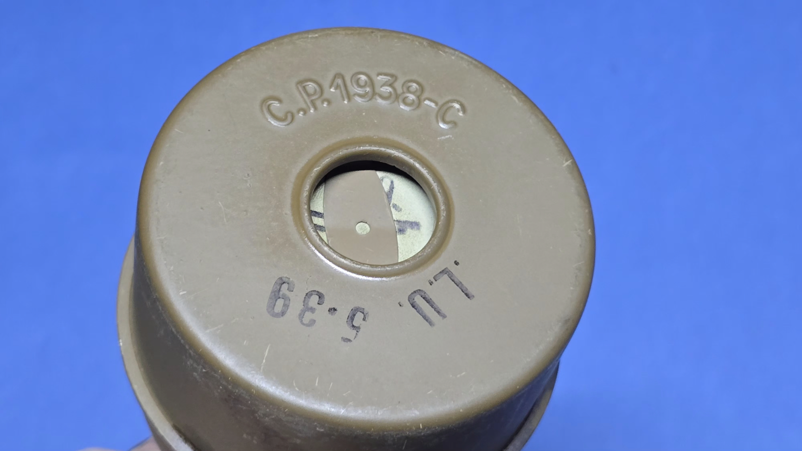 Stamped “C.P. 1938-C L.U. 5-39” with a distinctive circled “Z” maker’s mark, identifying the Cartouche Protectrice Modele 1938 manufactured in May 1939. Paint finish is excellent, showing light storage wear only; internal paper disc remain visible.