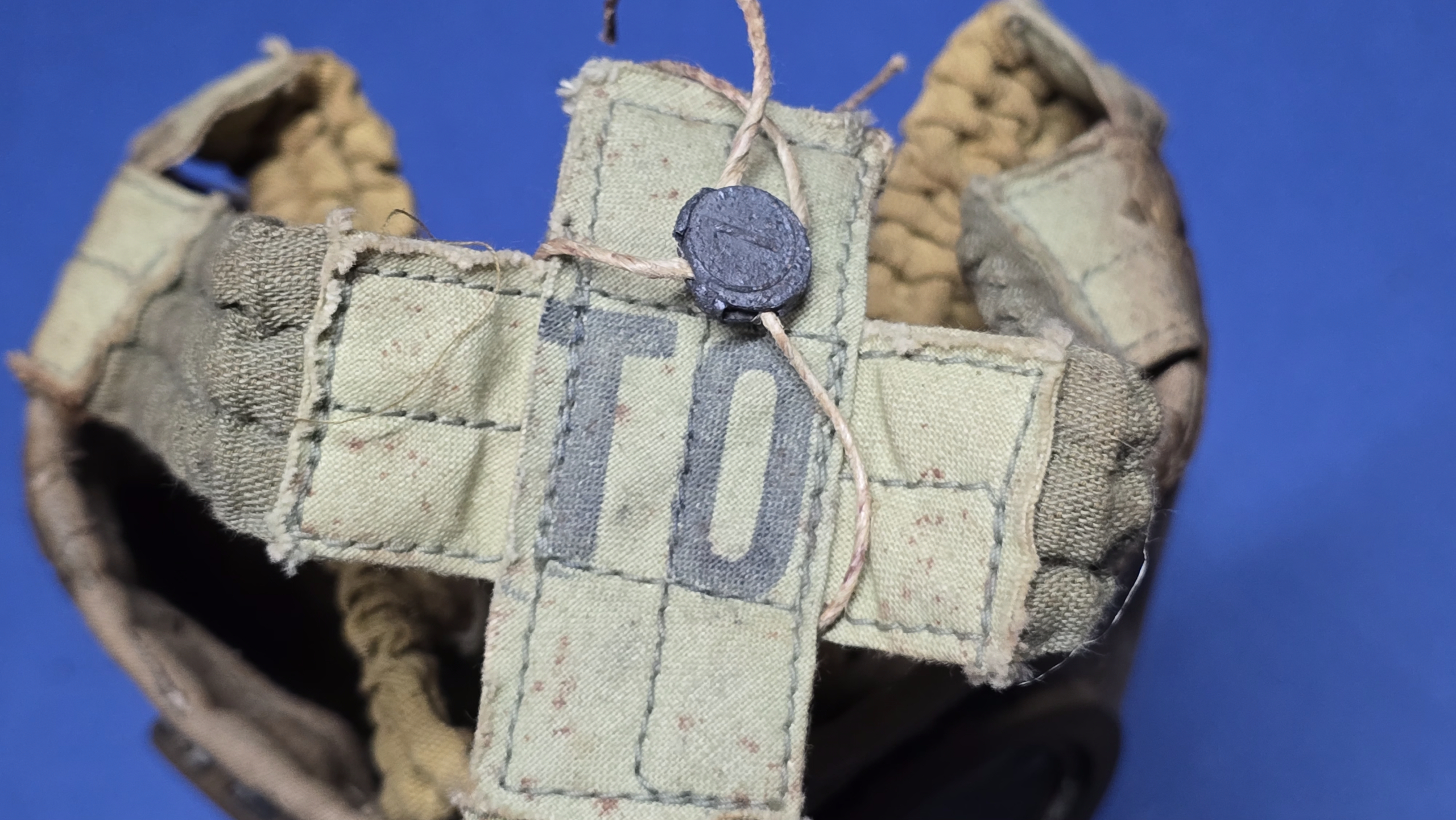 Constructed from Khaki-tan canvas with stitched leather reinforcement and an inner black-rubber face seal. The twin glass eyepieces remain clear and secure, while the internal web harness retains all six original elastic straps with only minor age toning. The facepiece carries crisp ink stamps “TC-38 TO JG-12-39.” The exhale valve and fitting are intact.