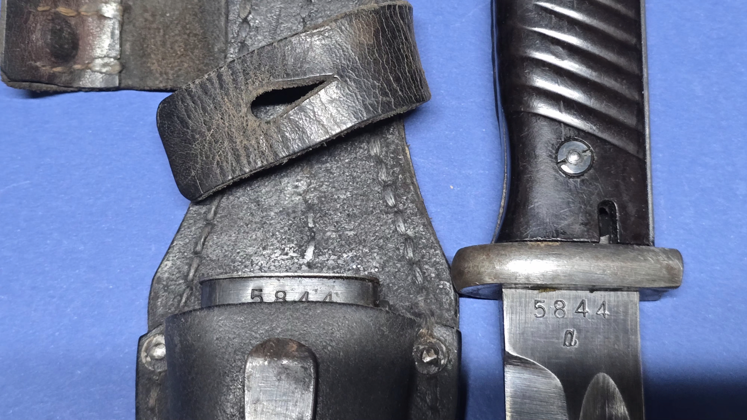 The scabbard is nice and straight, showing no dents or damage. It shows areas of original bluing remaining, mixed with mostly light surface rust. The lower ball carries a further Waffenamt stamp, and the throat screw is present. The front is stamped with the matching serial number 5844, and the reverse shows 42 ASW. The blade fits the scabbard perfectly, as it should from a matching pair.