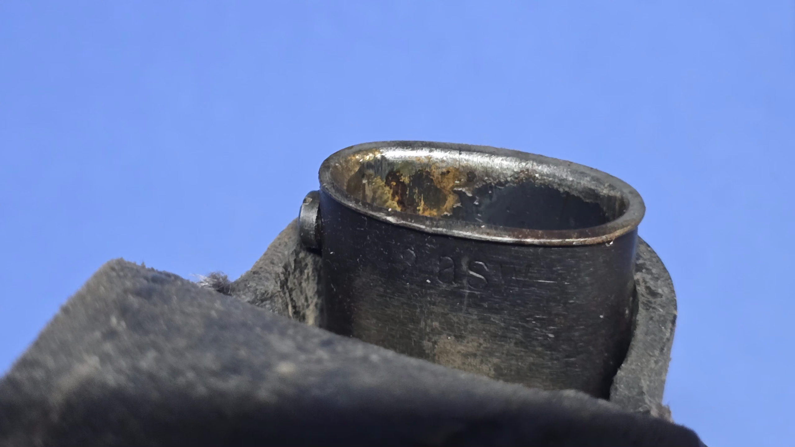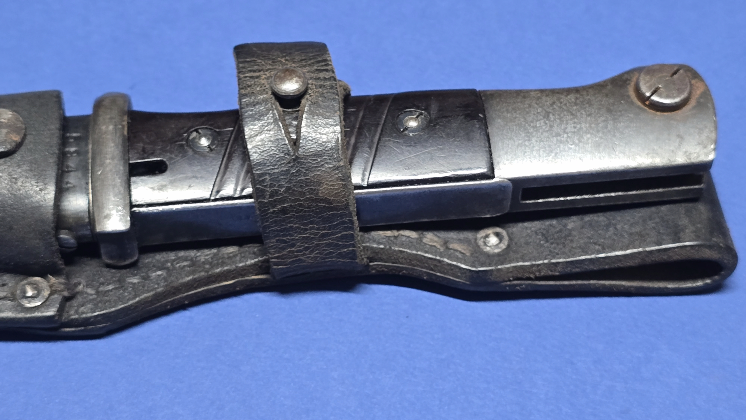 It comes with a late-war, crude K98 frog, completely original to the period. A very similar example is shown on page 234 of Roy William’s book “A Collector’s Guide to German Bayonet Belt Frogs, 1825-1945.” These late-war frogs were put together quickly using previously-used leather parts, often showing wide, uneven stitching-and this one fits that description well. The small perforated holes around the front also match the reused-leather construction noted in the book. Despite the crude finish, the frog is structurally sound, with all four rivets in place.
