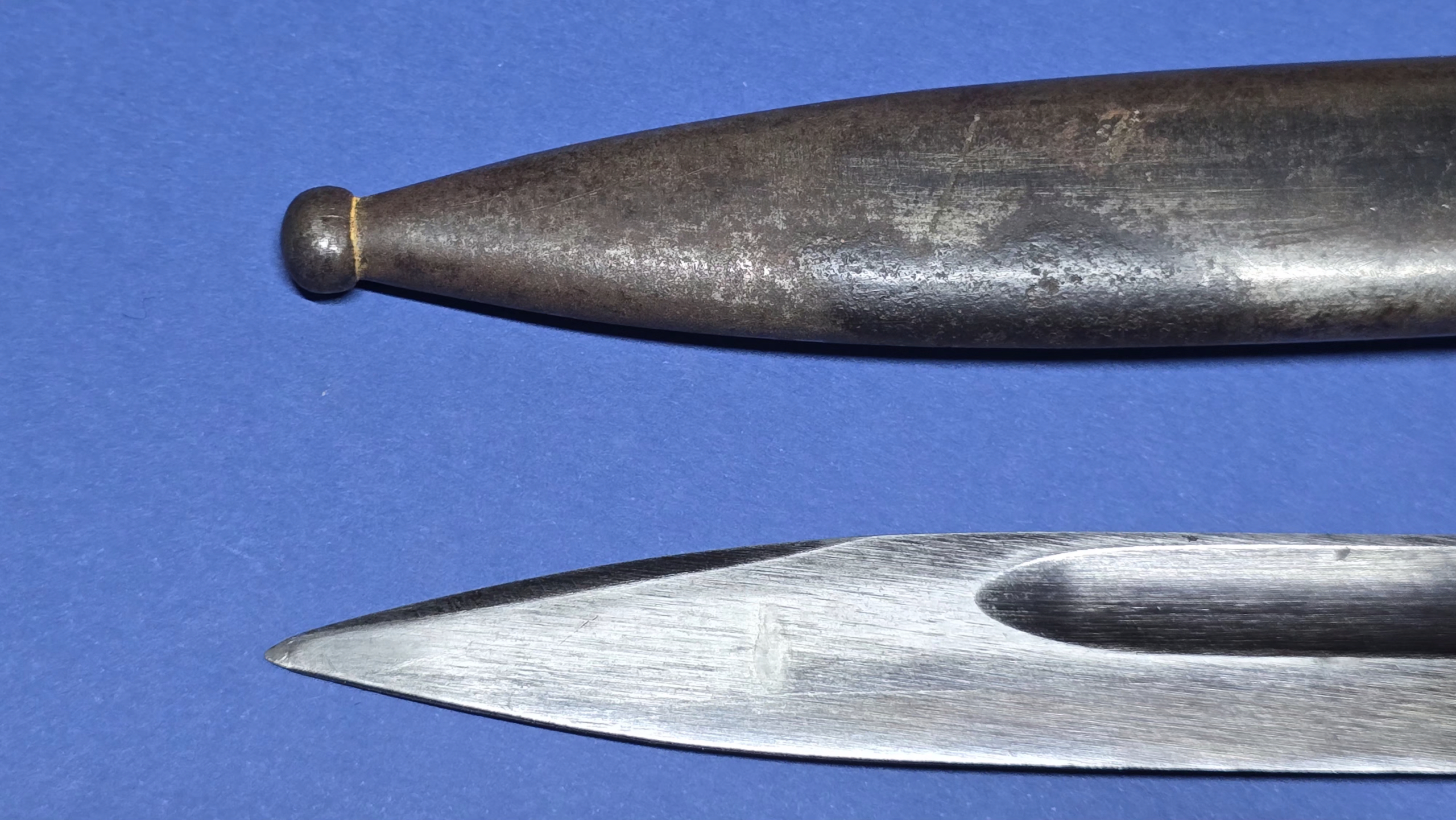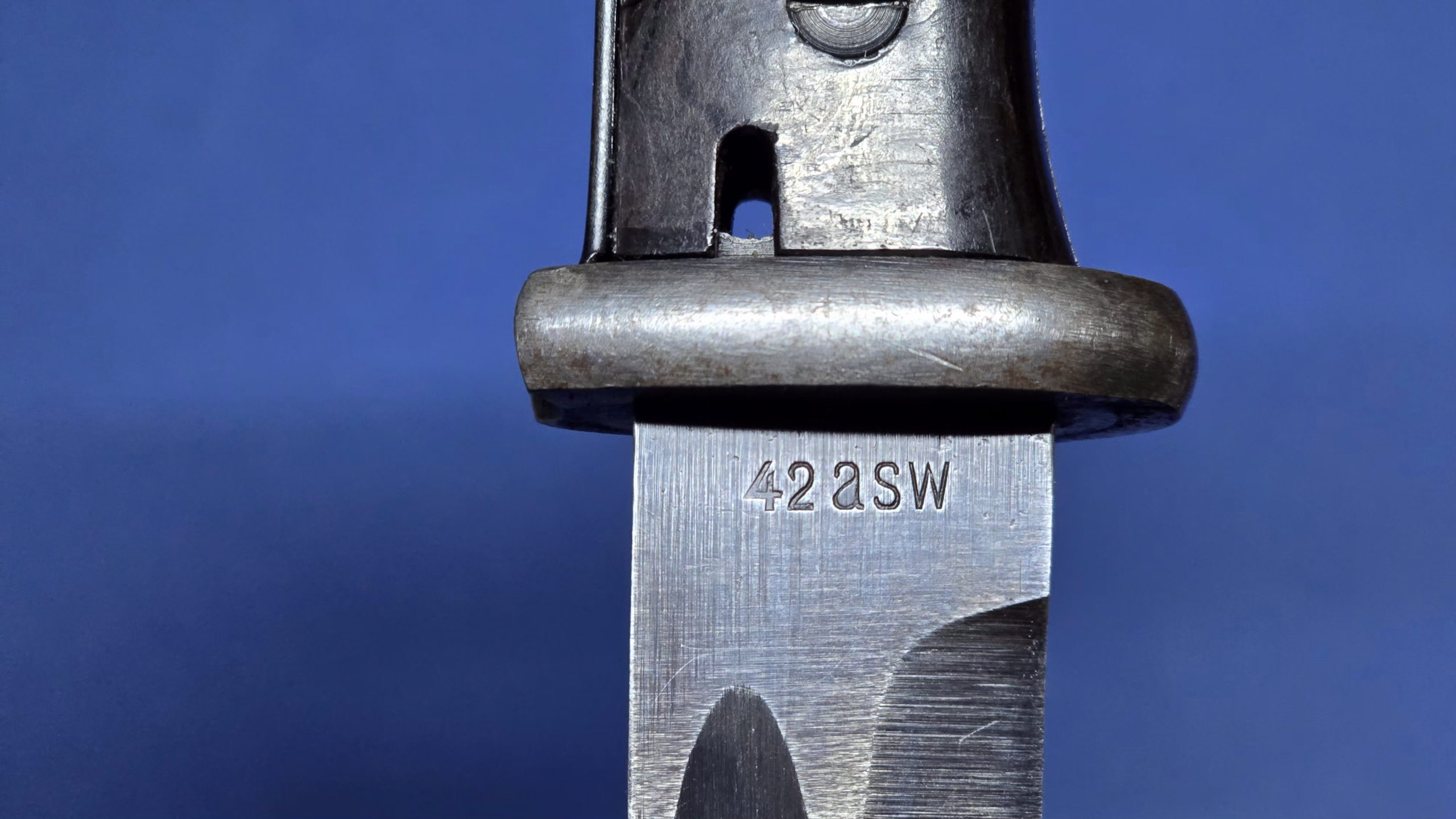 The unsharpened blade is in excellent overall condition, still holding around 95% of its original bluing. One side is marked 42 ASW (1942 – E. & F. Horster), and the other side carries the serial number 5844. The only small point worth mentioning is that the tip isn’t quite as fine as we usually see on some examples.