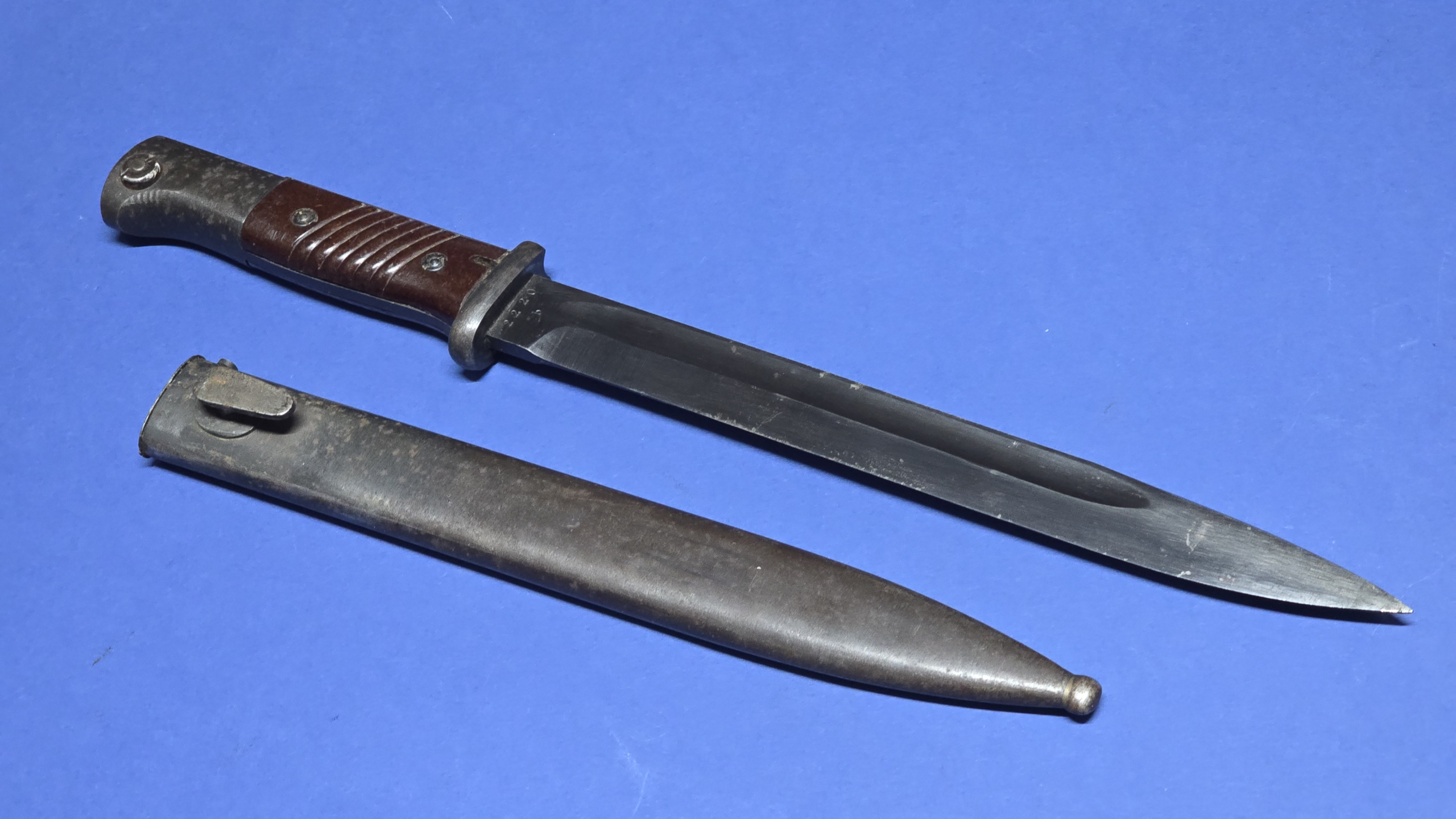 The scabbard is in excellent condition with no damage or indentations. It retains its original throat screw and shows a Waffenamt marking to the lower ball. It is serial numbered 2220, matching the blade, and marked 44CRS on the reverse, confirming a matching set. The finish and tone of the scabbard closely match the hilt and crossguard, giving a consistent overall appearance. The bayonet fits snugly, as it should.
