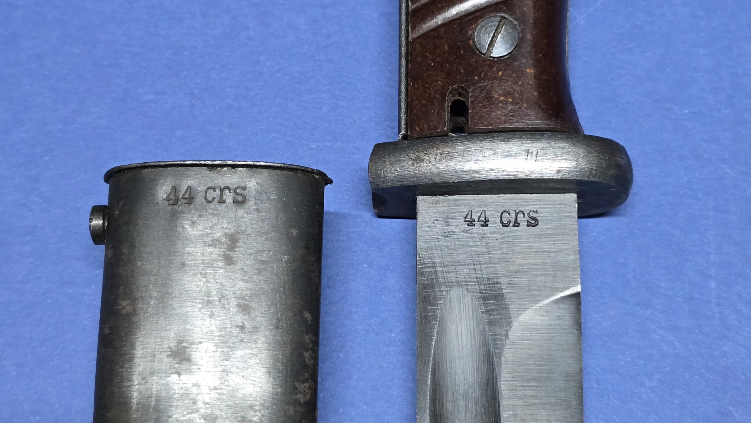 A late war example of a WWII German K98 bayonet, dated 44, produced by CRS (Paul Weyersberg & Co). As expected for this stage of the war, the finish shows the typical reduction in machining quality, with a more coarse appearance across the hilt and fittings. That said, this is a solid, honest piece with matching numbers.