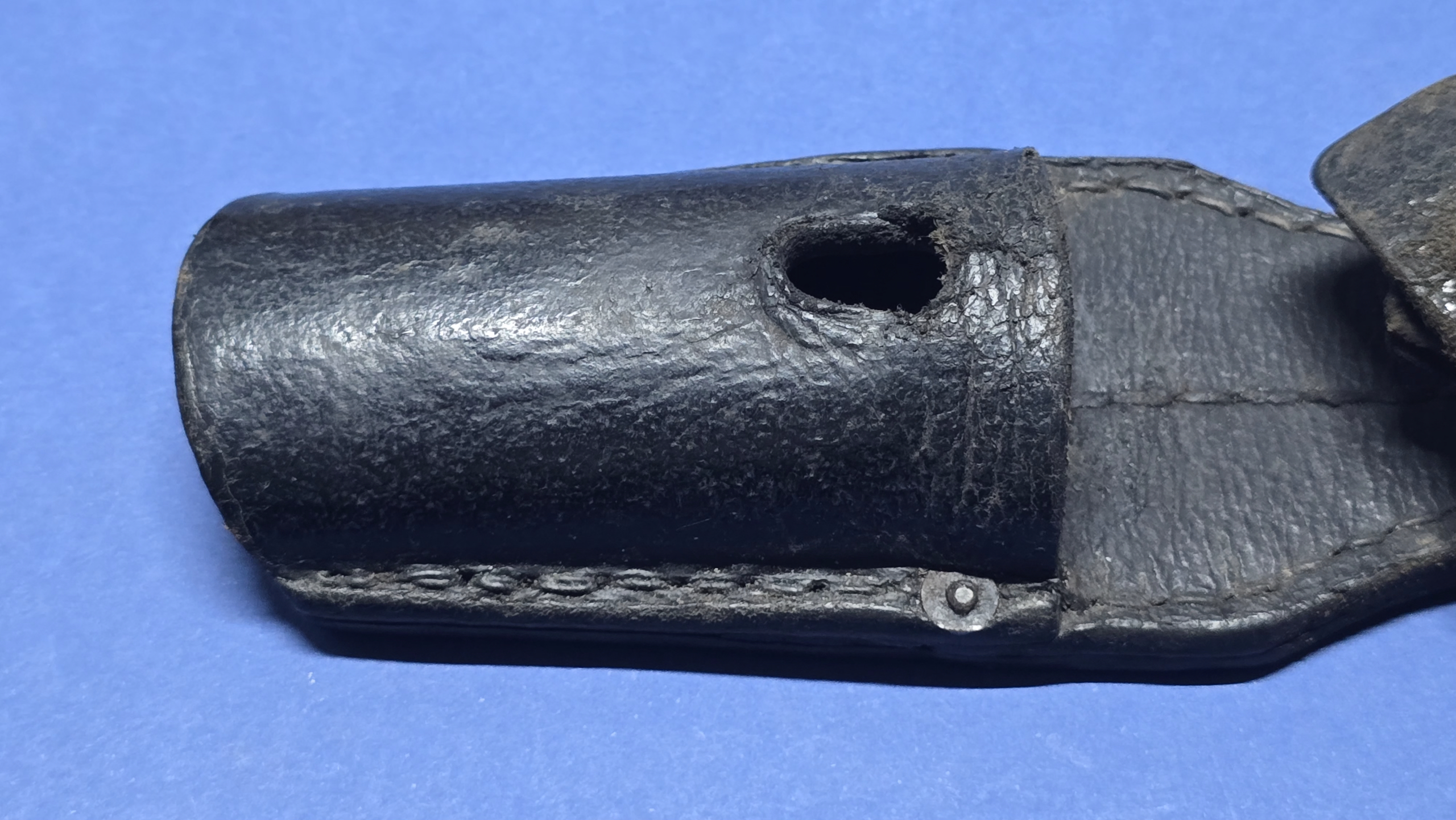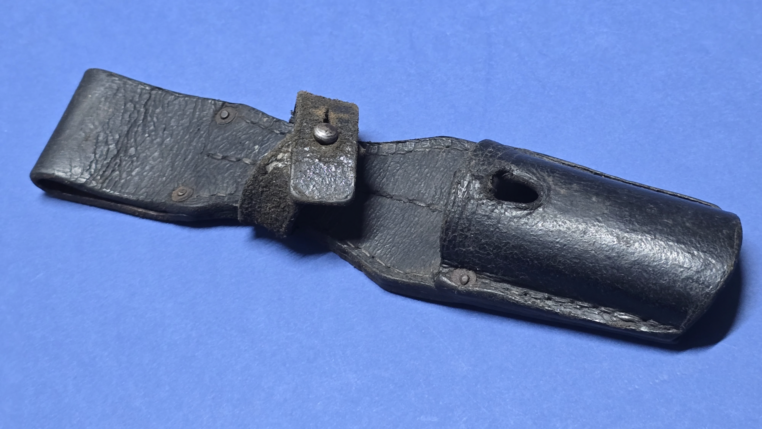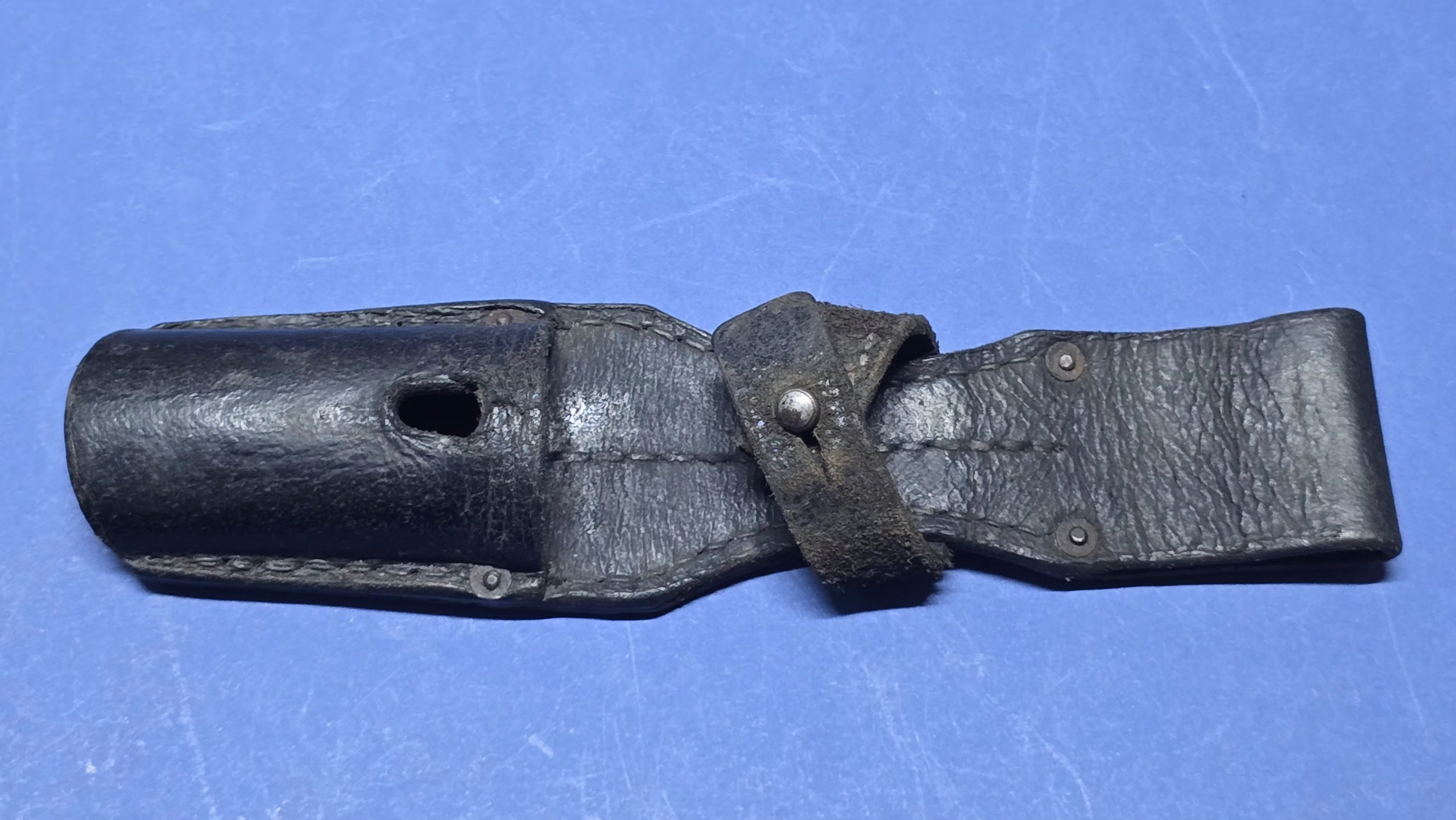 Late-war K98 bayonet frogs of this type are illustrated and discussed in A Collector’s Guide to German Bayonet Belt Frogs, 1825–1945 by Roy Williams, where simplified leather construction is documented as a response to material shortages during the closing phase of the war.