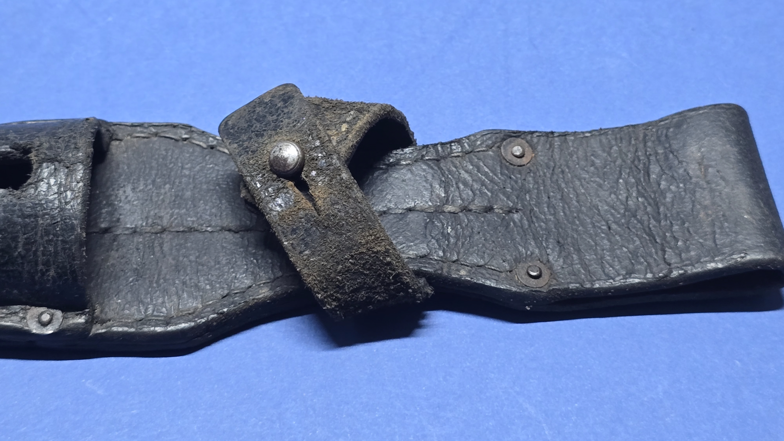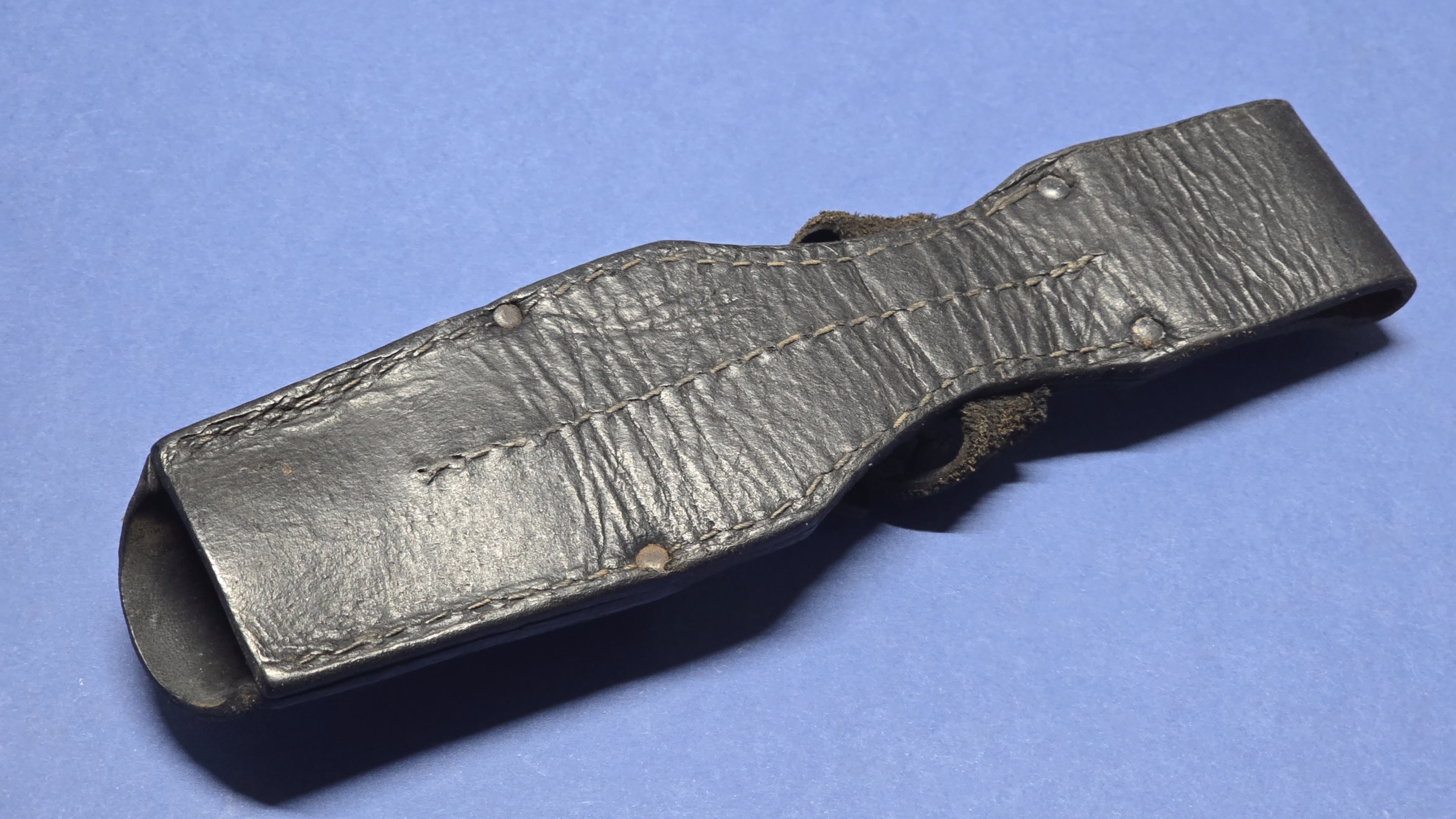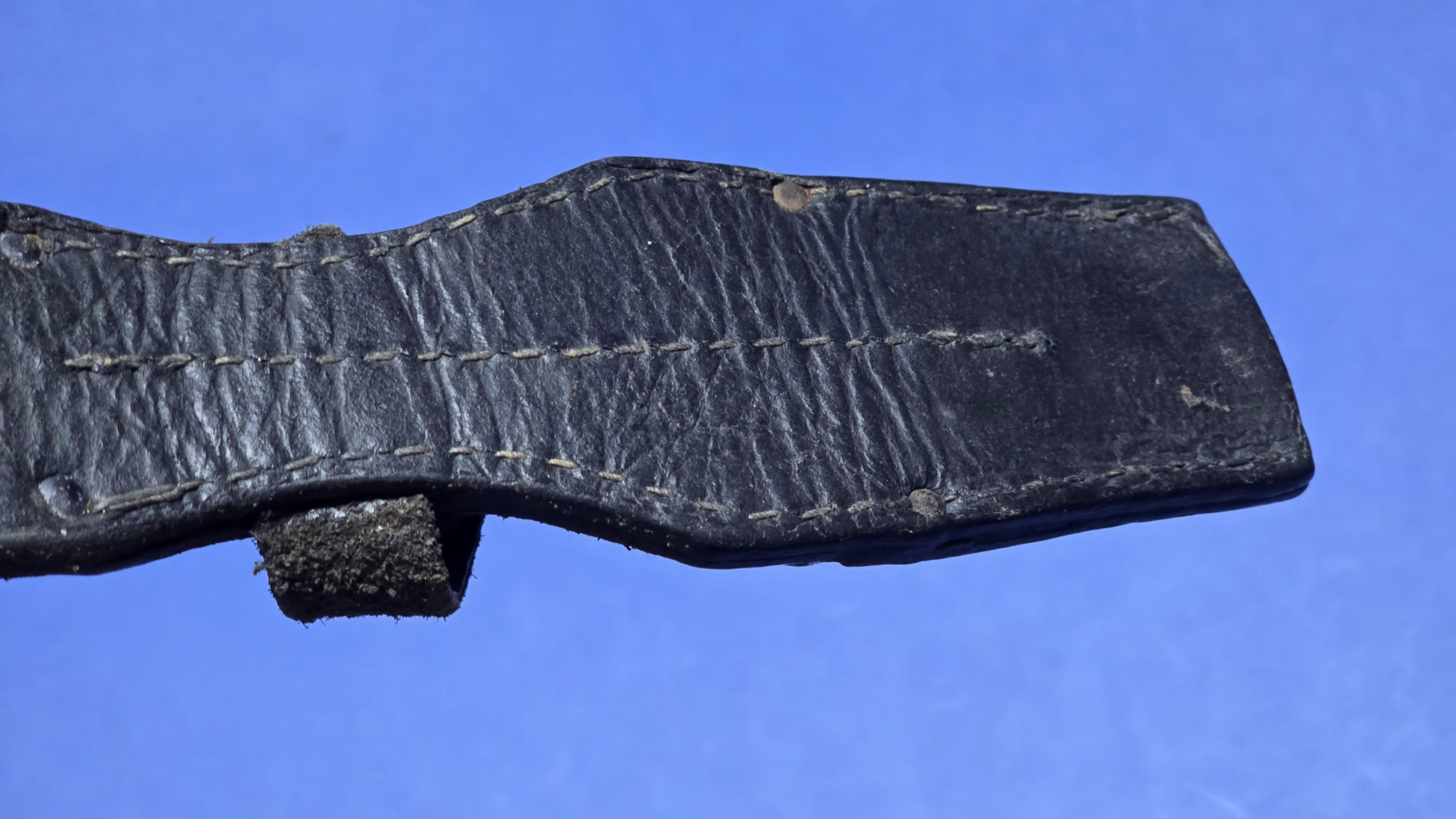 All original stitching remains present, tight, and secure throughout. The original four rivets are correctly placed, with no signs of replacement or tampering.