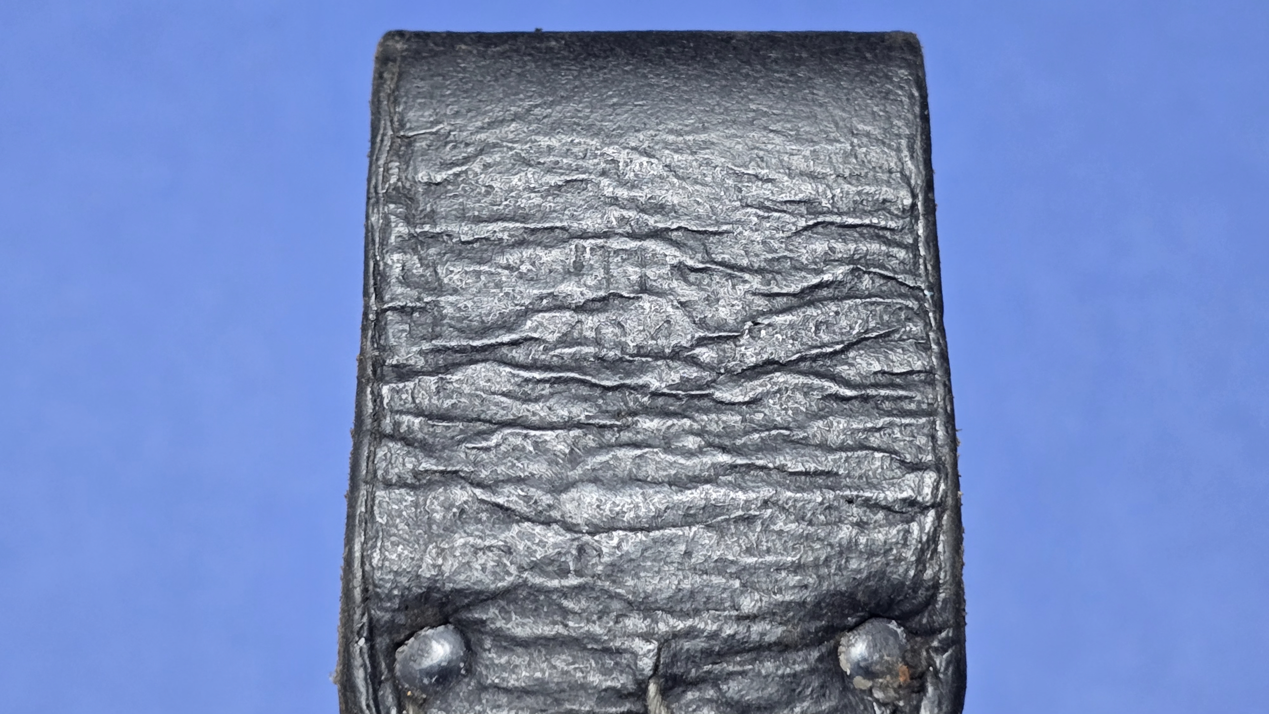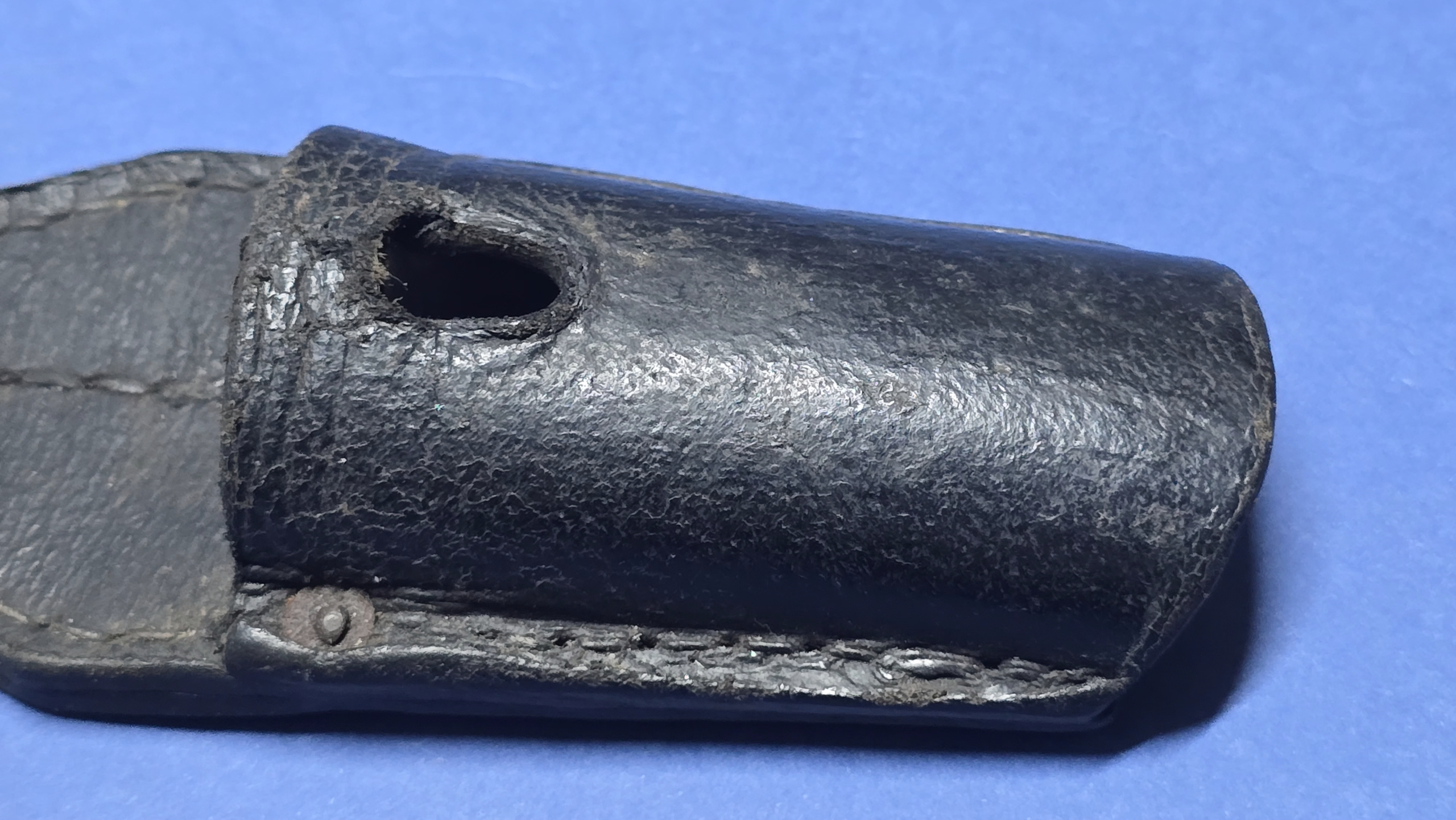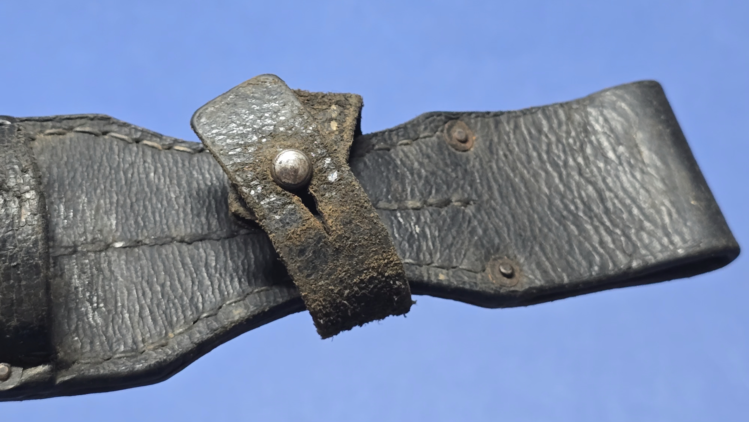 All original stitching remains present, tight, and secure throughout. The original four rivets are correctly placed, with no signs of replacement or tampering.