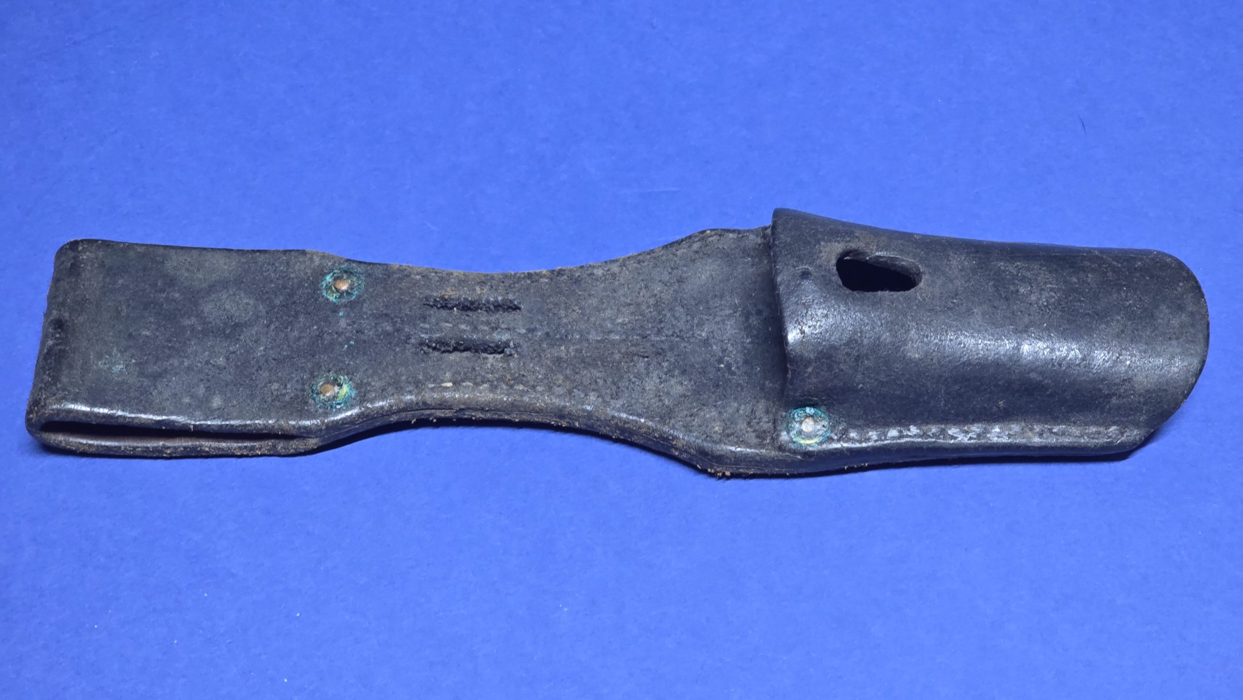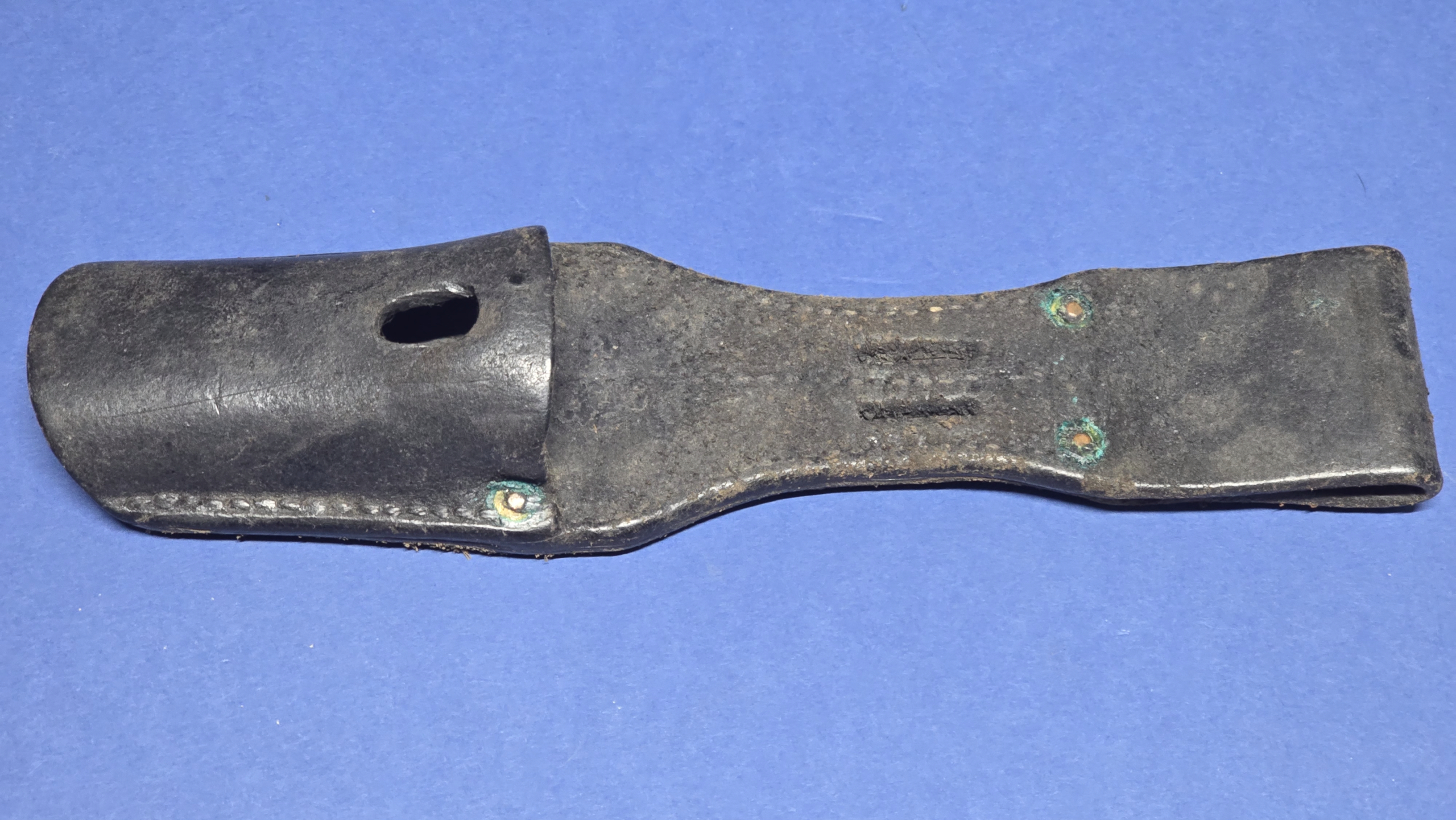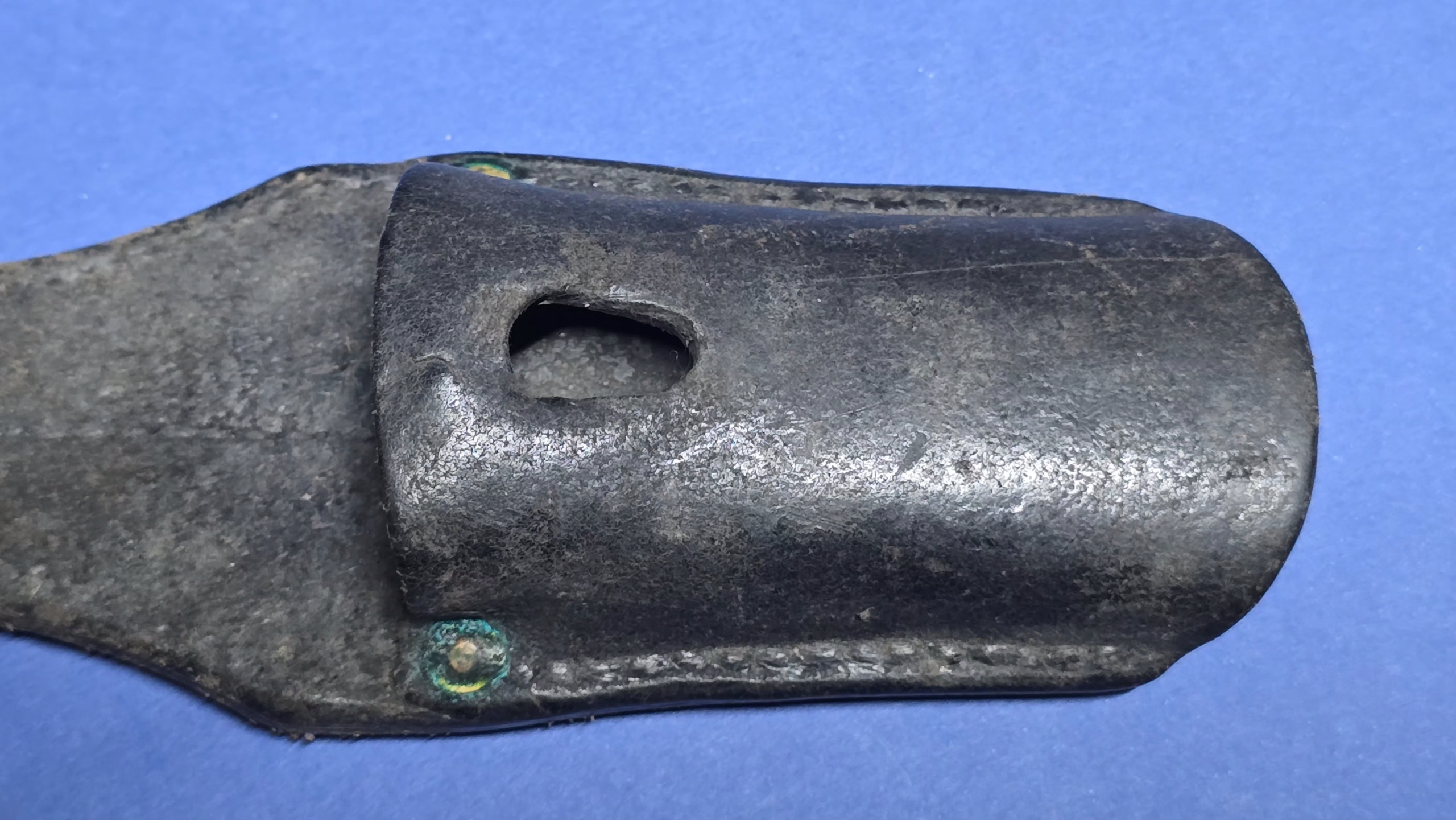 The leather remains firm and retains a good overall shape. There is clear wear to the rear face, consistent with service use, but no structural failure. All stitching is present, intact, and secure. The front face, particularly around the scabbard lug slot, remains in very good condition and presents well — this being the most visible area when mounted.