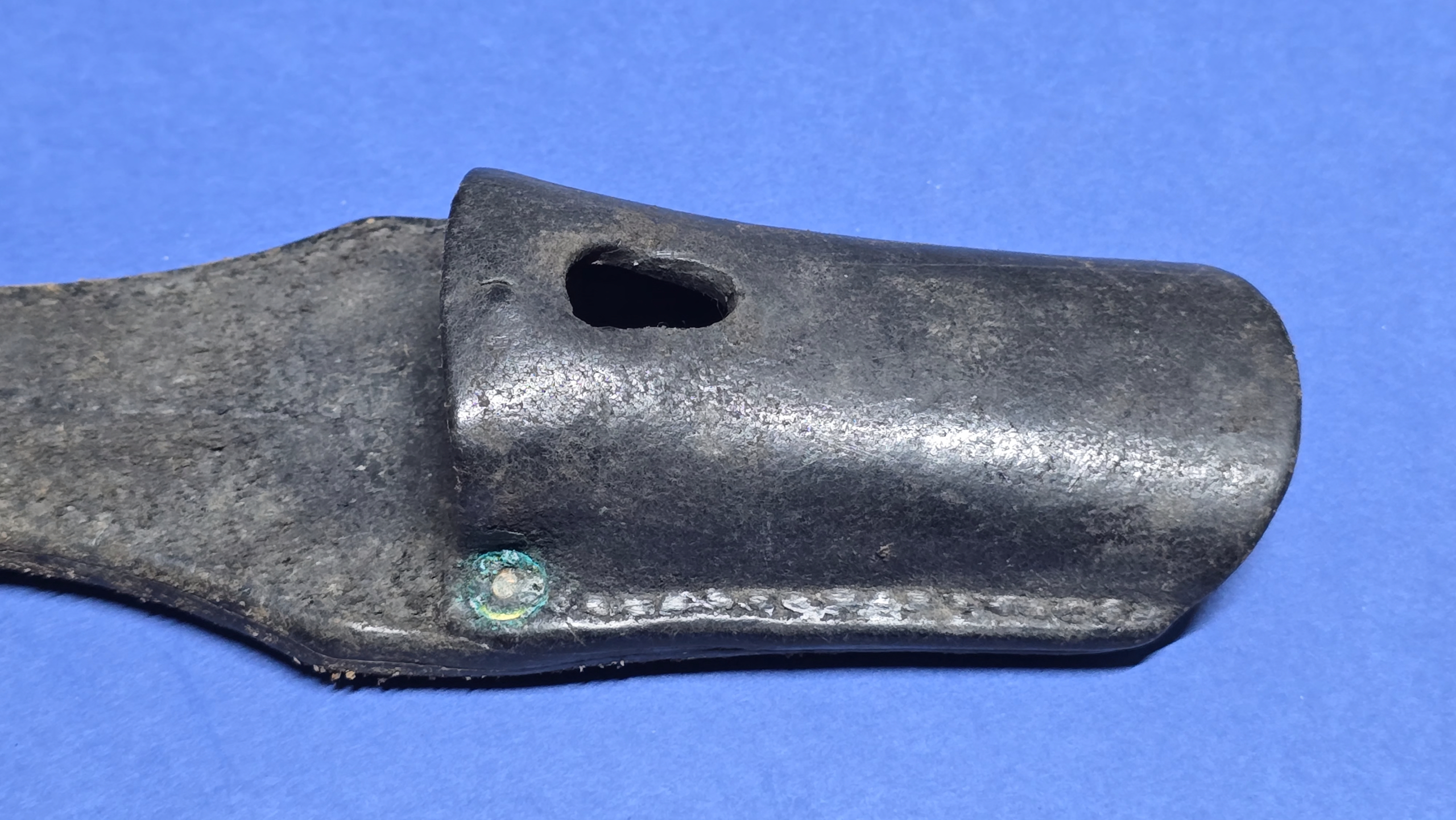 The scabbard lug slot to the front is clean, well-defined, and shows minimal distortion. This area remains in excellent condition.