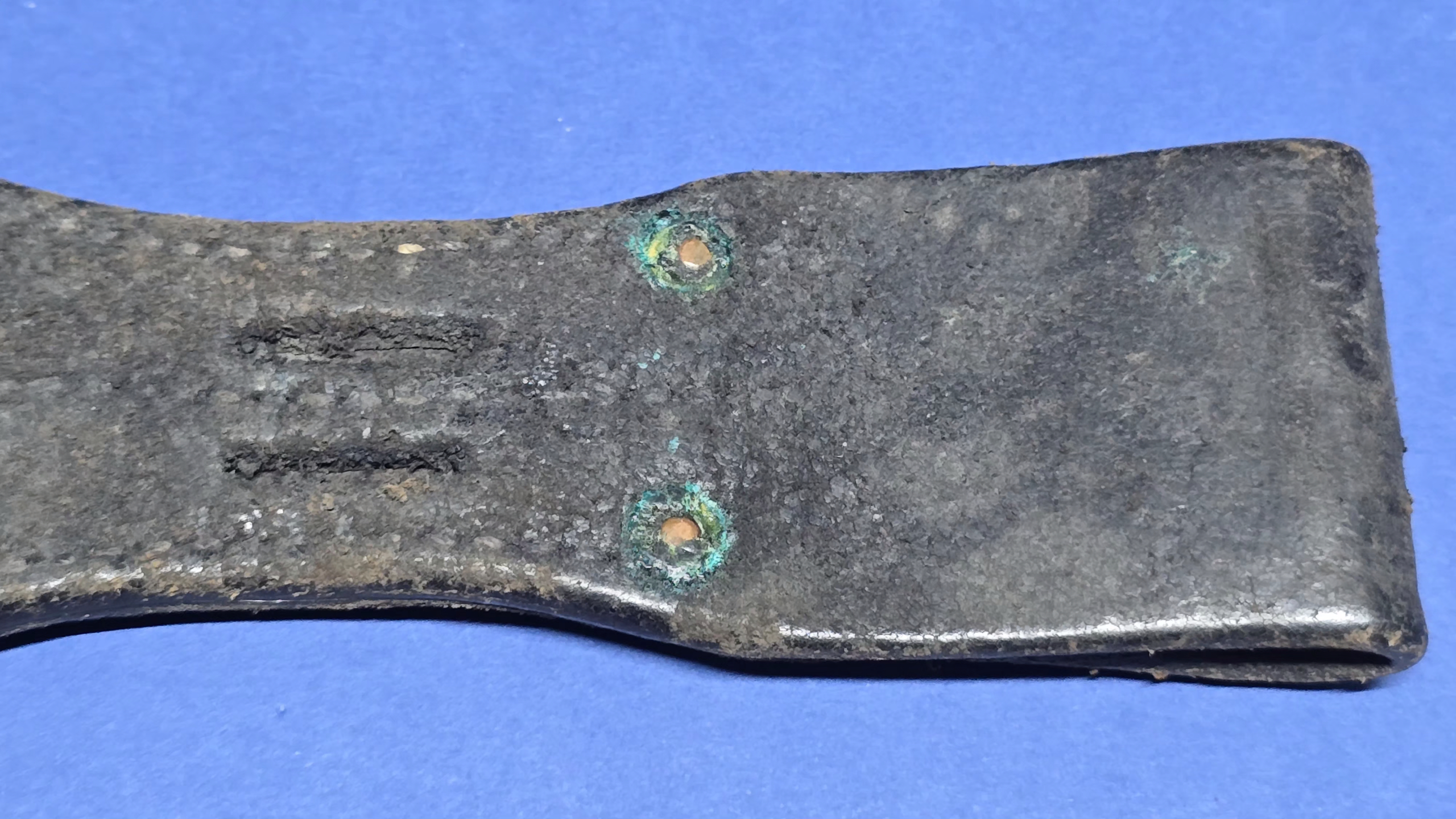 Fitted with four original brass rivets, all intact and tight. The rivets display a natural green verdigris patina, which is a positive sign of age and long-term originality. No signs of replacement or later interference.
