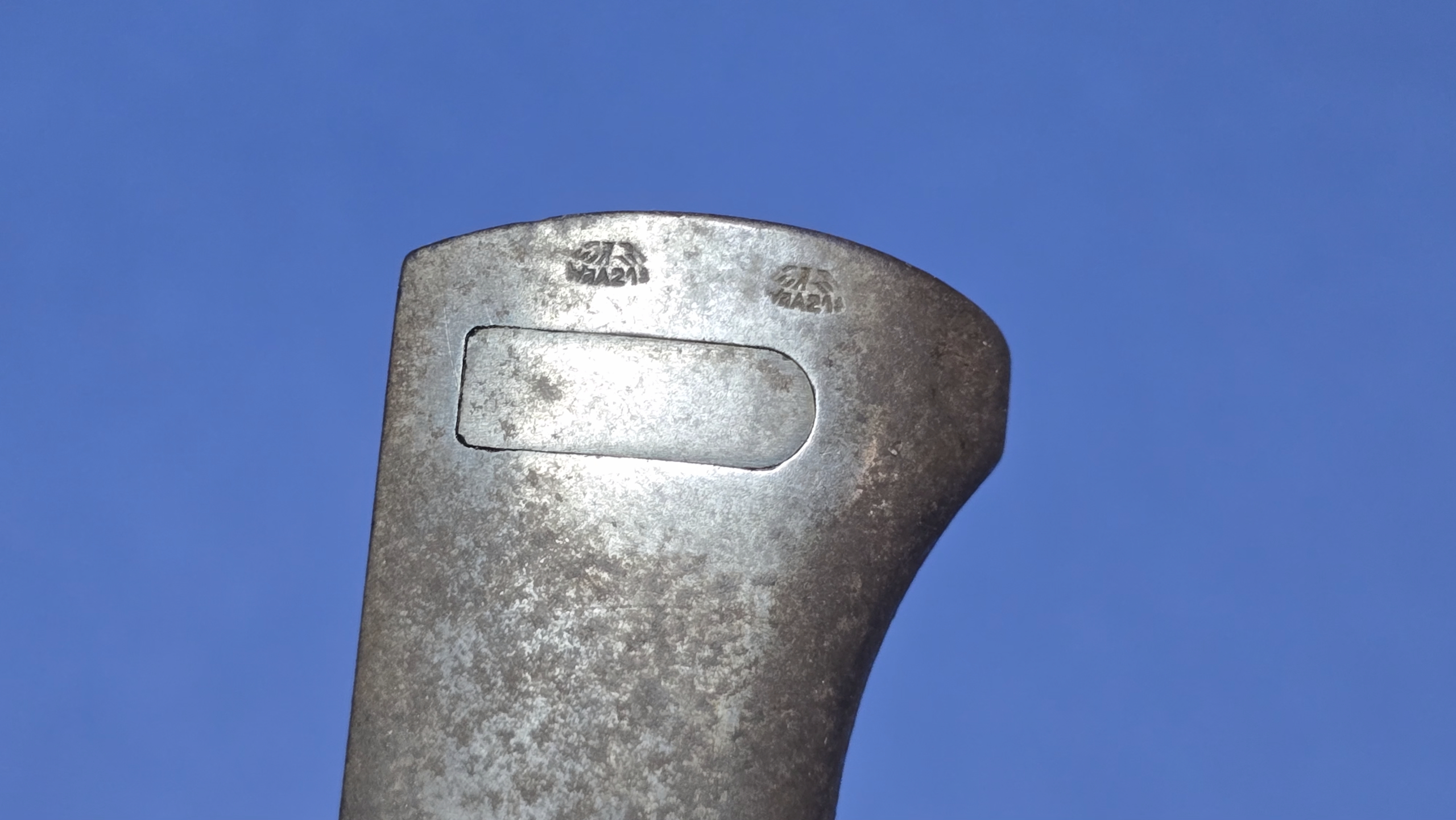 Dark bakelite grips in excellent condition, and secured by two screw bolts. The hilt shows two Waffenamt inspection stamps, as expected, along with a fully functioning rifle retaining button. Light surface rust is present on the hilt but overall in nice untouched condition.
