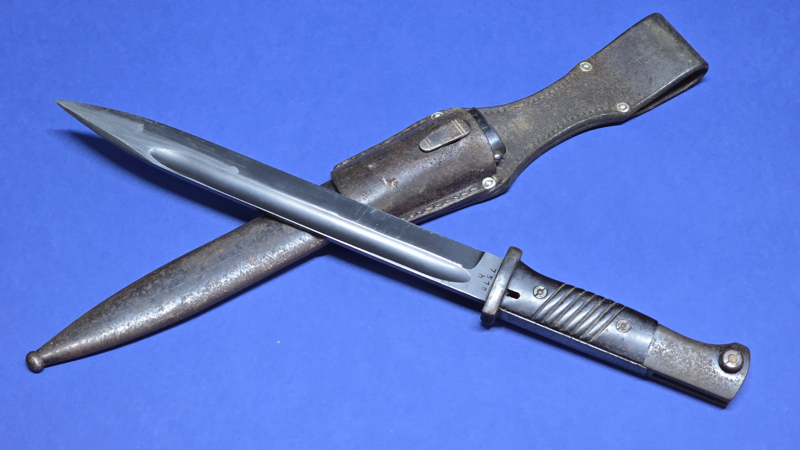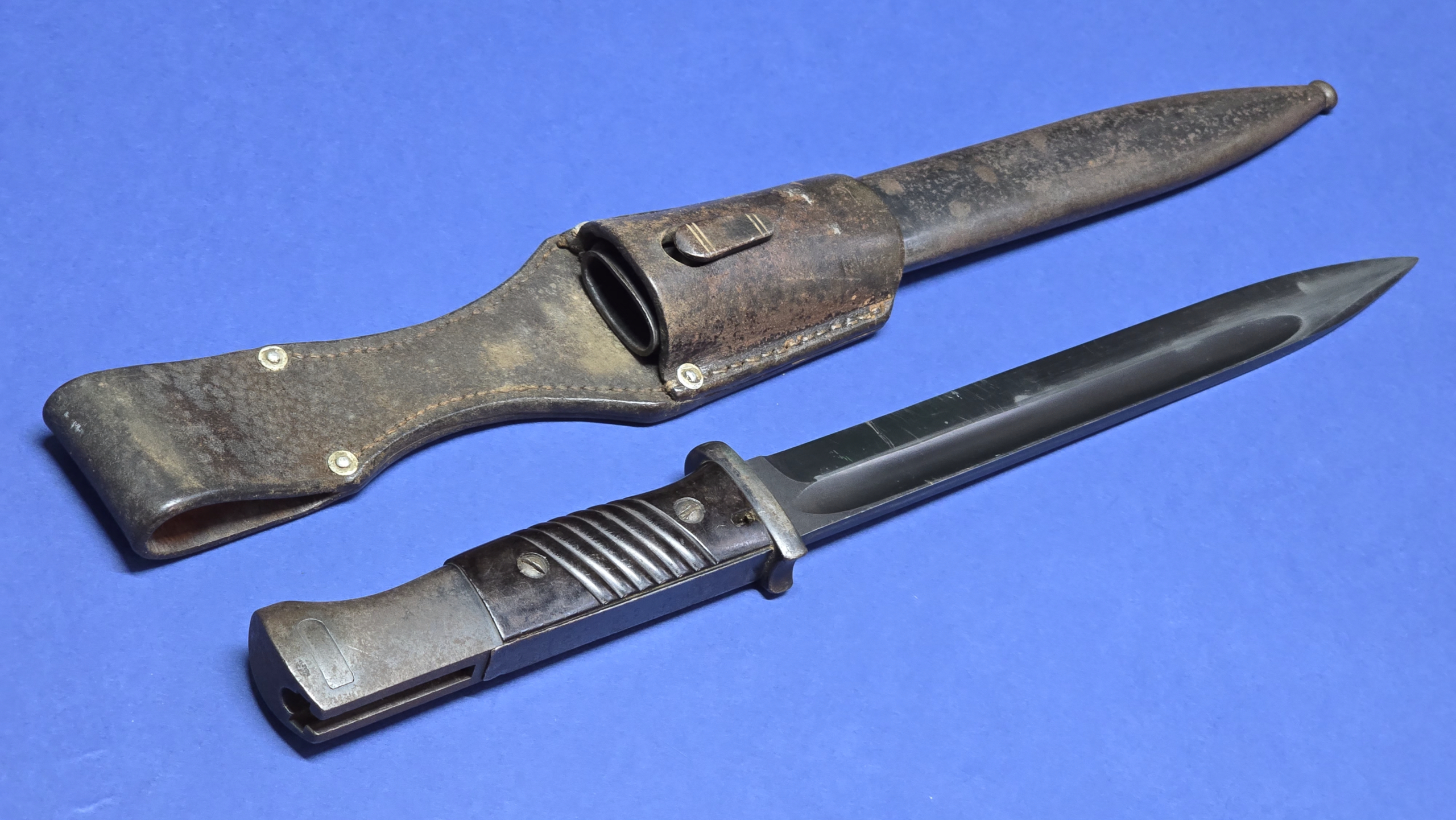 Accompanied by a very good condition leather K98 frog. The leather remains strong, with all stitching and rivets intact. The bayonet fits the scabbard perfectly, exactly as a matching pair should.