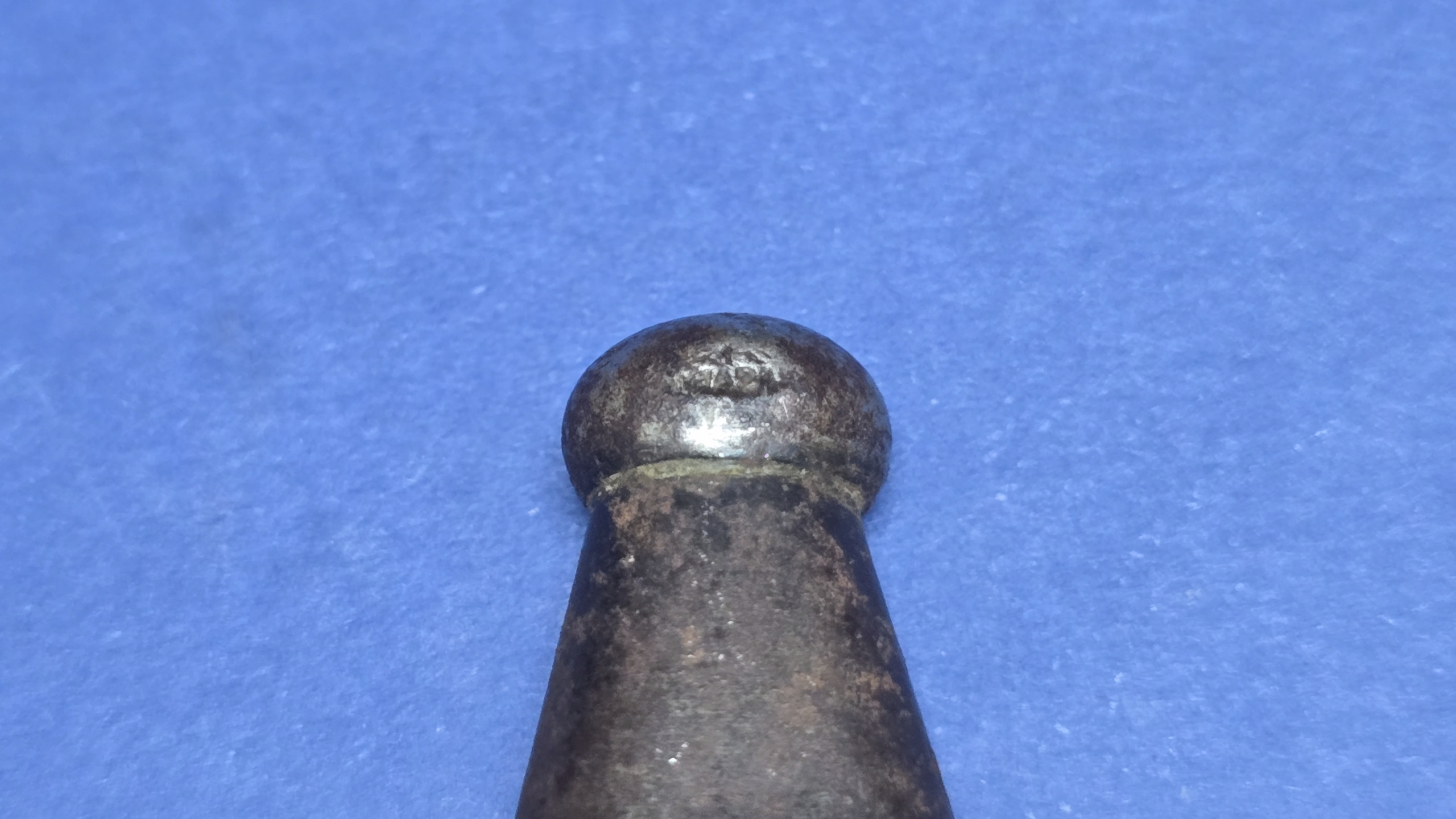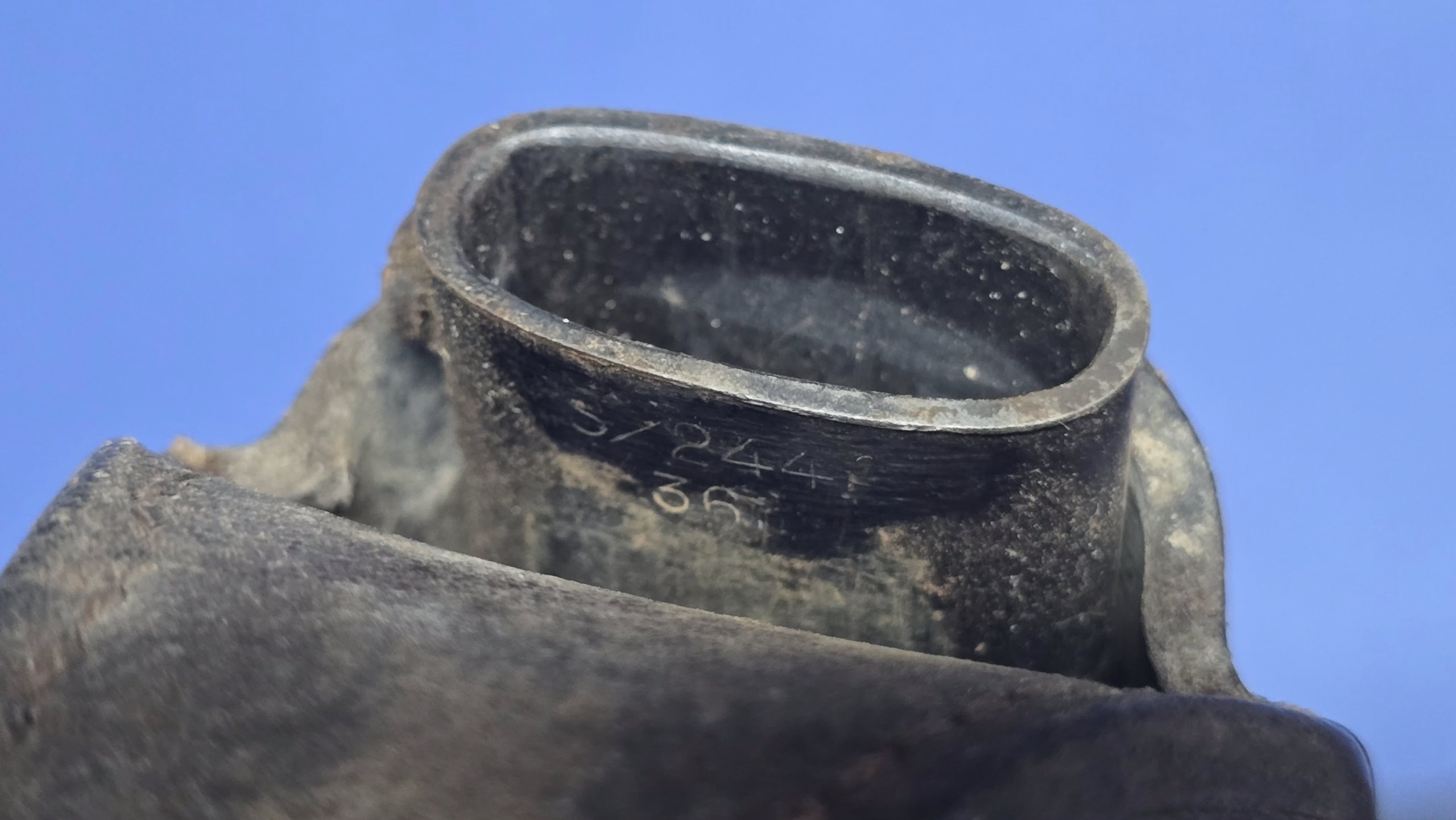 Undented, with original bluing, although, there is light surface rust present from honest age. The throat screw is present. The scabbard bears the matching serial number 7518 on one side, and on the reverse the same S/244,36, markings as the blade – a desirable feature that tells us the two pieces have always lived together. The lower scabbard ball also carries a Waffenamt stamp.
