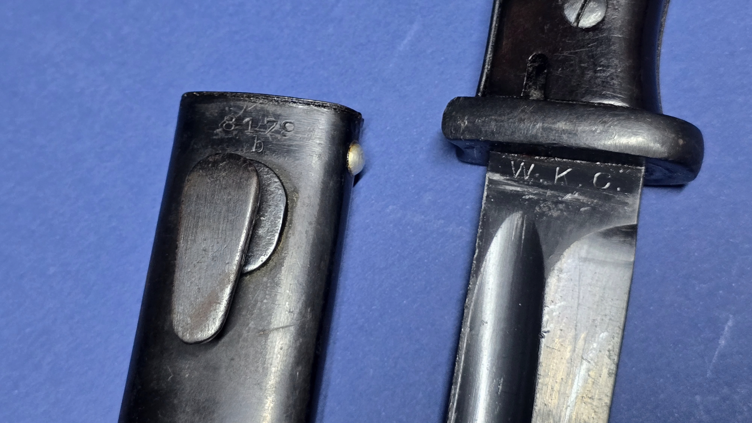 The bayonet fits the scabbard perfectly, and overall this is a fine example of the famous K98 bayonet – combining early-war blade production by WKC with a later war scabbard by Borg & Co, and showing both the quality of manufacturer and the adaptations forced by wartime shortages.
