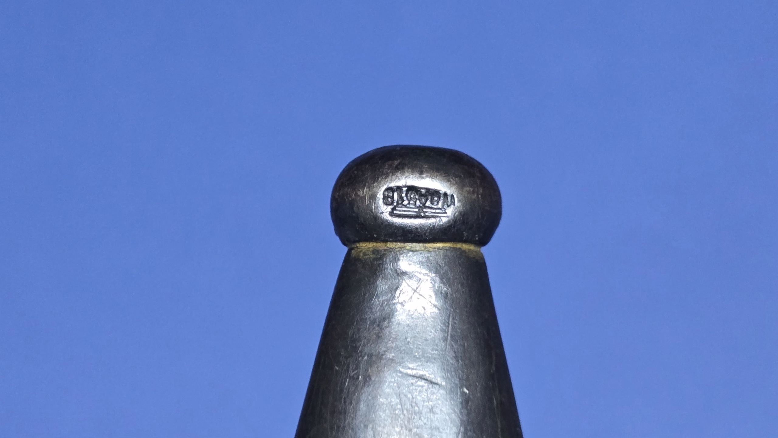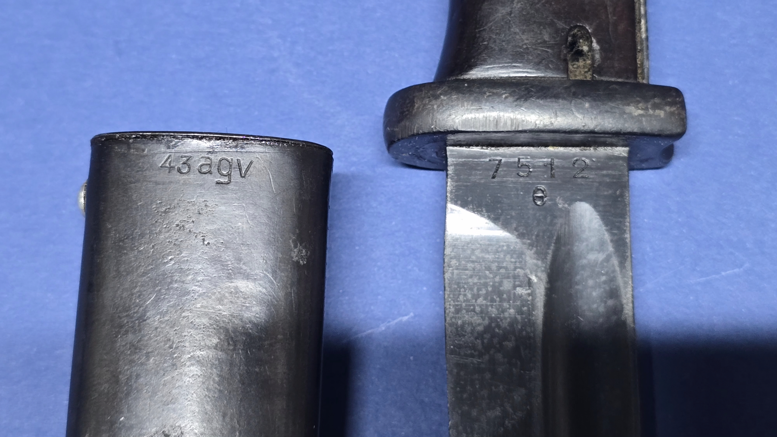 The scabbard is undented, retaining a strong portion of its original bluing. A Waffenamt stamp is also present on the lower scabbard ball. The reverse is marked 43 AGV, identifying the maker as (Berg & Co, Solingen), and the date 1943. The opposite side shows the serial number 8179. Interestingly, the throat is secured with a late-war aluminium rivet instead of the earlier steel screw – a wartime economy measure reflecting Germany’s shortages of steel in the later years.