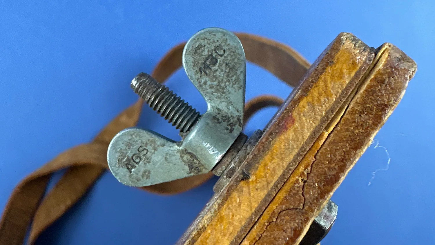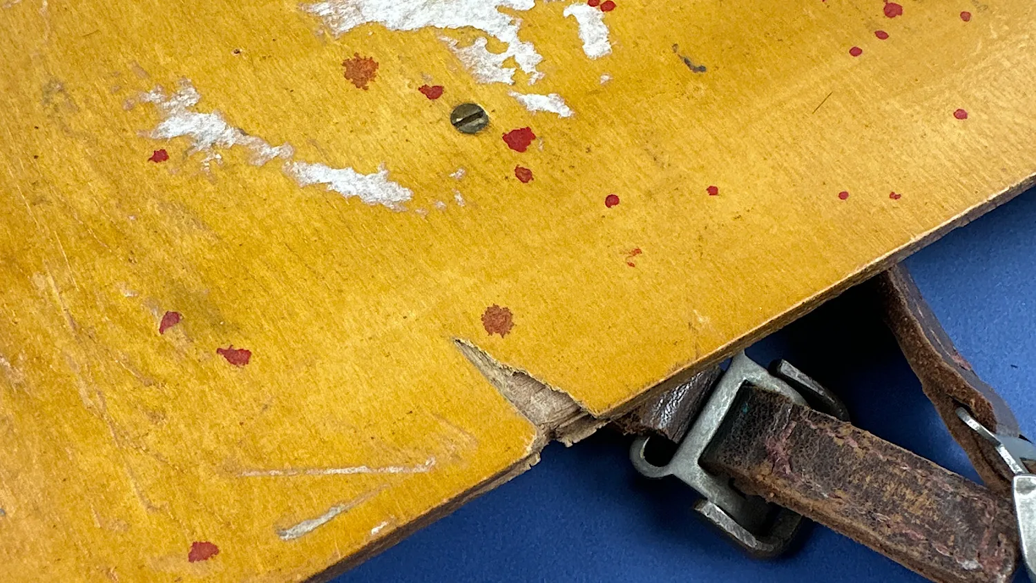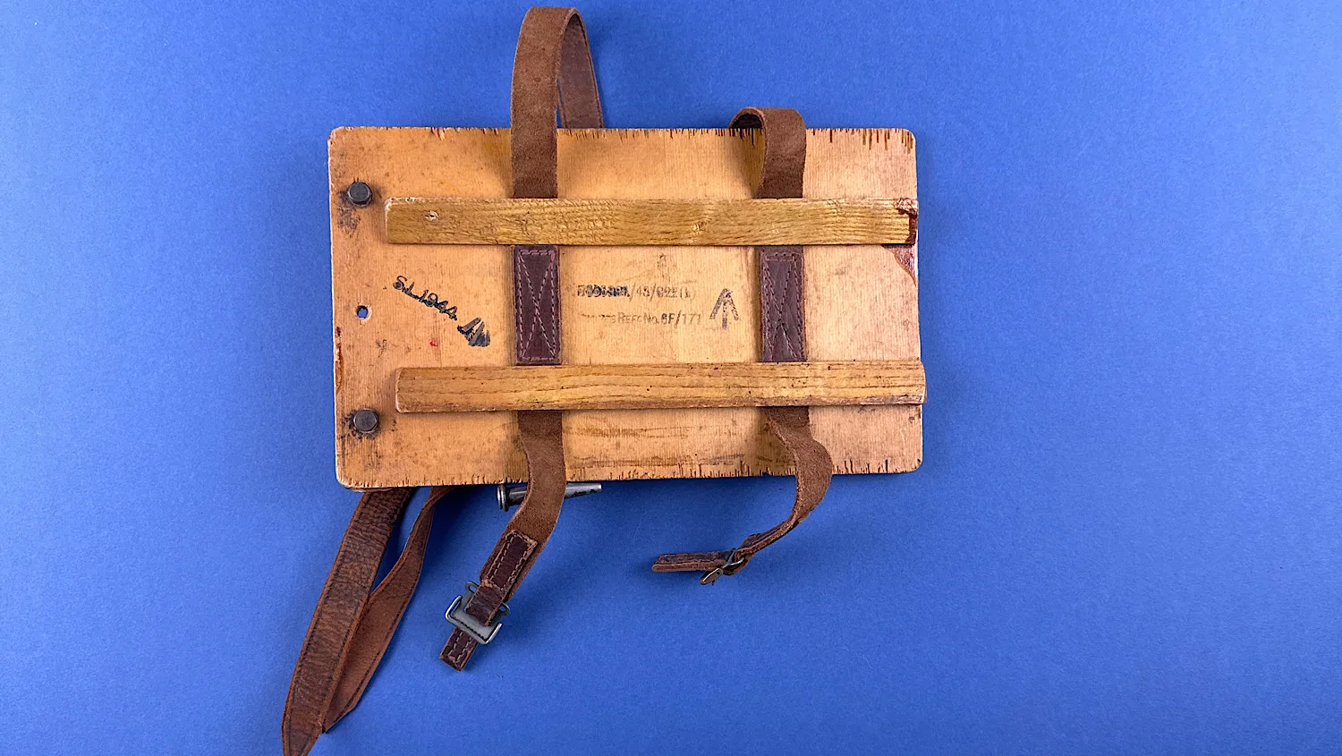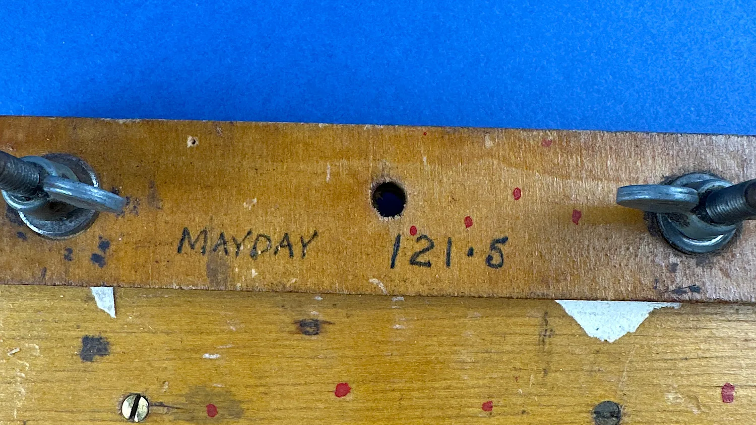 Holding the two leather straps in place is a pair of wooden supports. These are held in place by eight flat head screws (all present). Additionally, there’s a hand written mark on top of the board. “MAYDAY 121.6” which is a lovely touch.