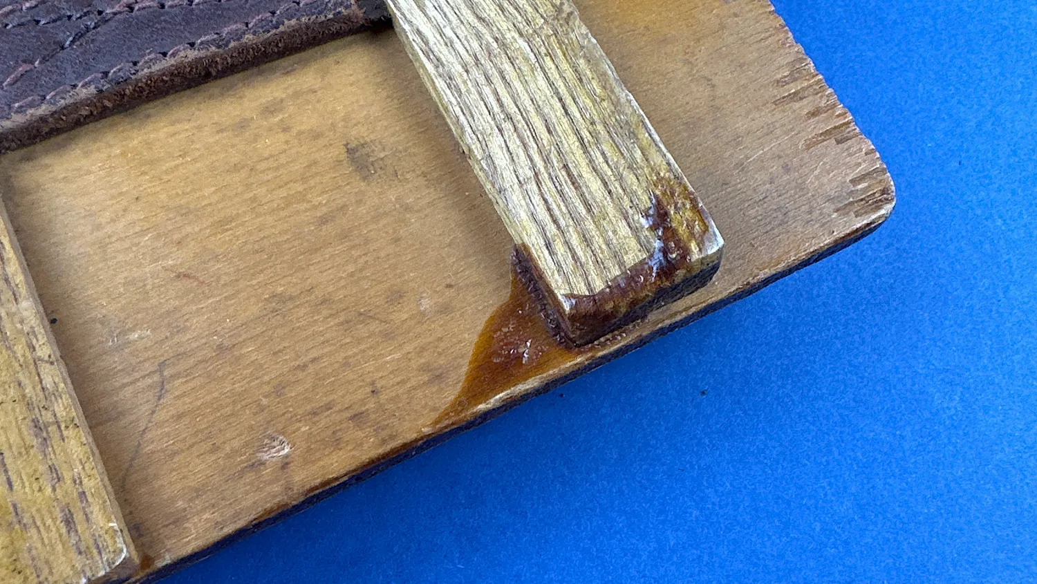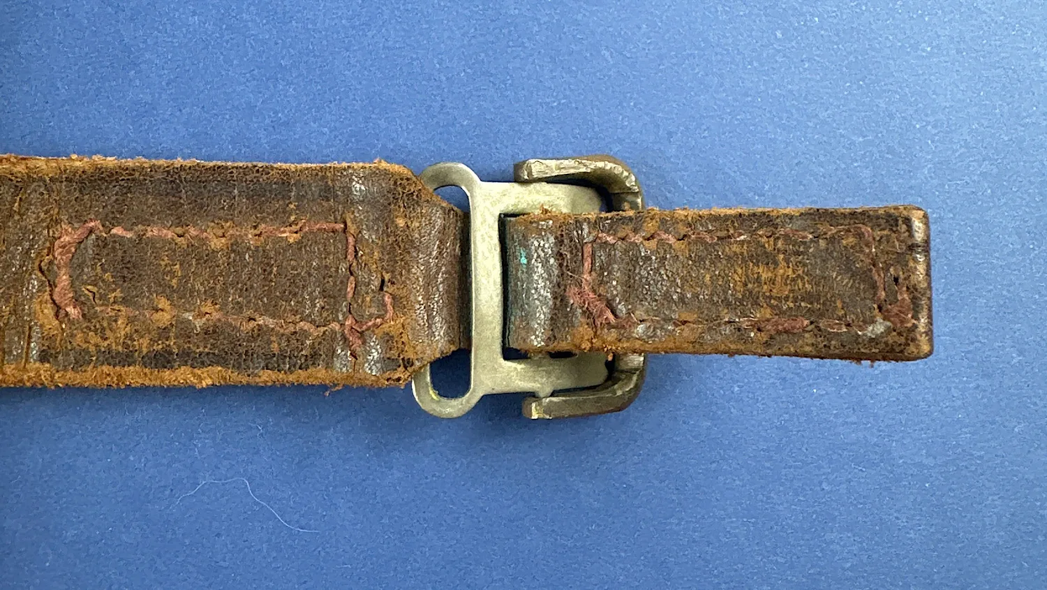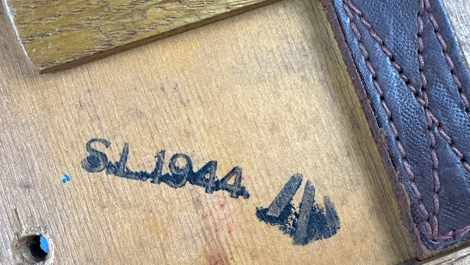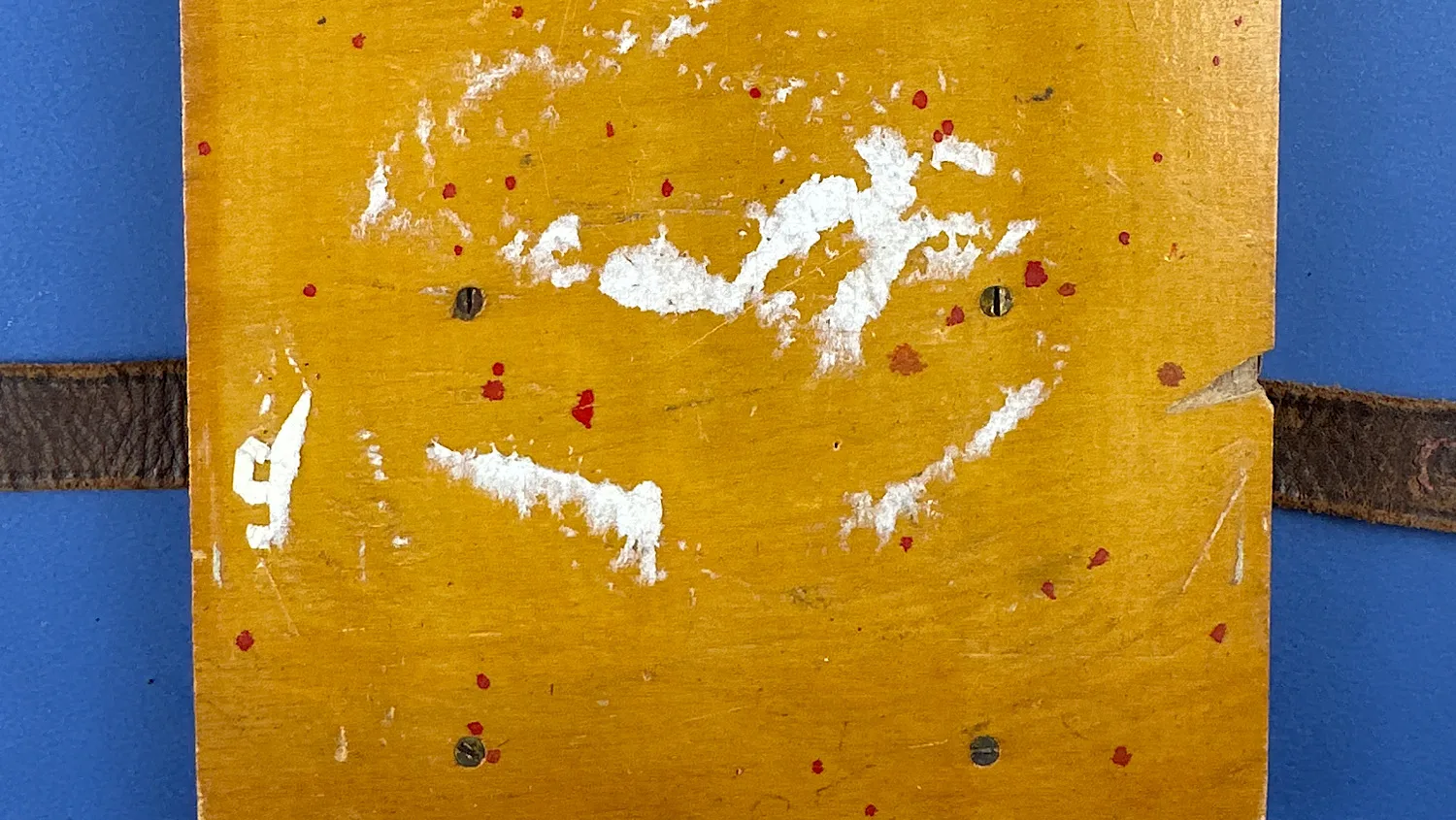 Holding the two leather straps in place is a pair of wooden supports. These are held in place by eight flat head screws (all present). Additionally, there’s a hand written mark on top of the board. “MAYDAY 121.6” which is a lovely touch.