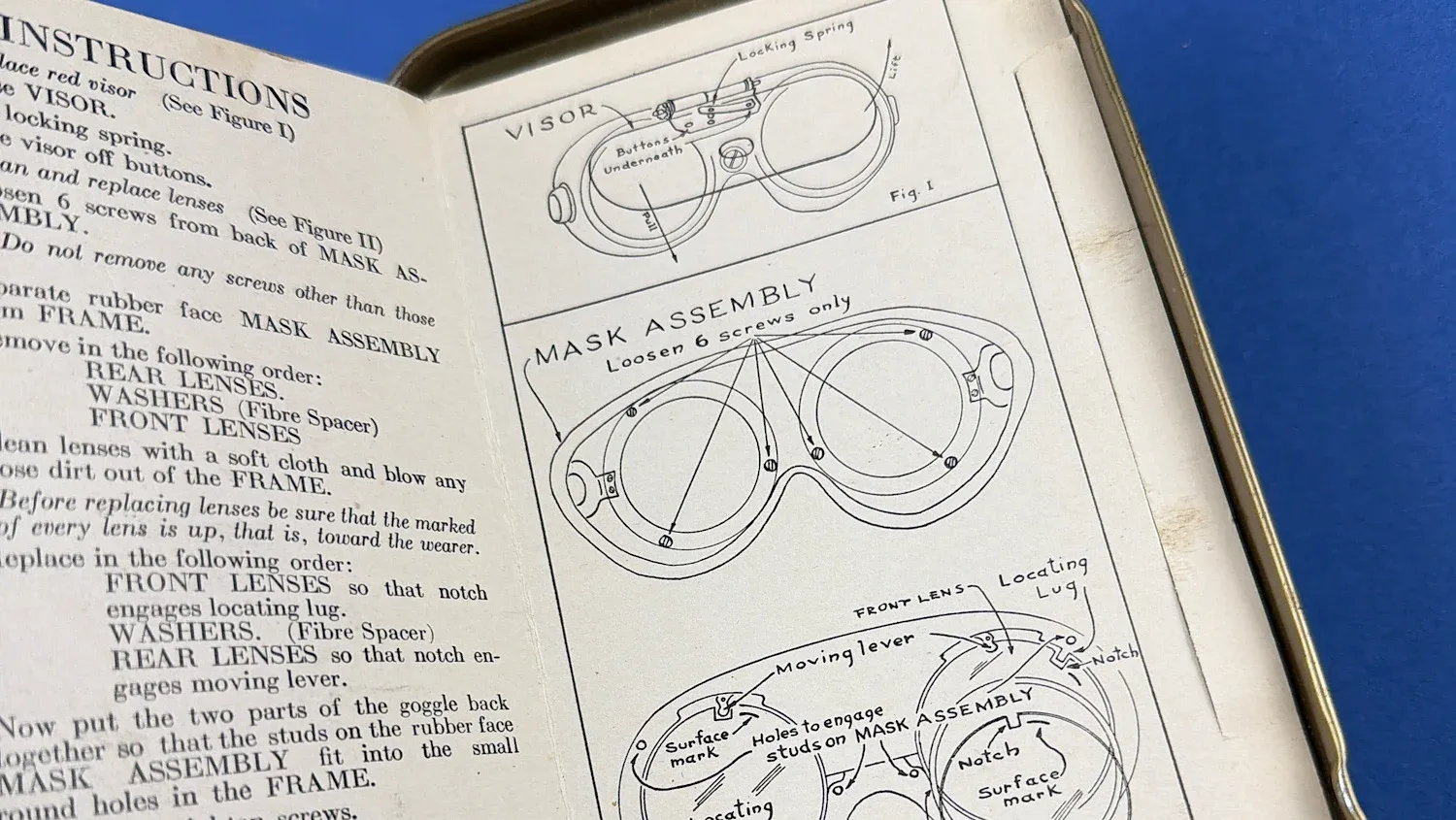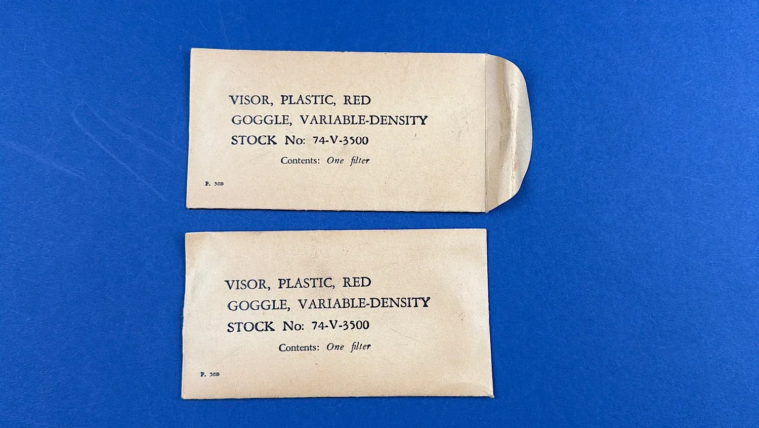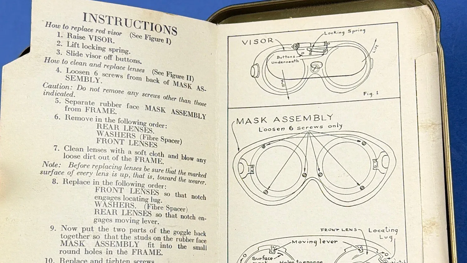 Importantly, this set is accompanied by its original American Optical Company metal storage tin, labelled “One Goggle Variable Density Visor Attachment” with the correct stock numbering. Also included are the original paper envelopes for the red plastic visor components (Stock No. 74-V-3500) and the printed instruction sheet covering maintenance and repair kit contents. Complete sets with original paperwork are becoming increasingly difficult to source.