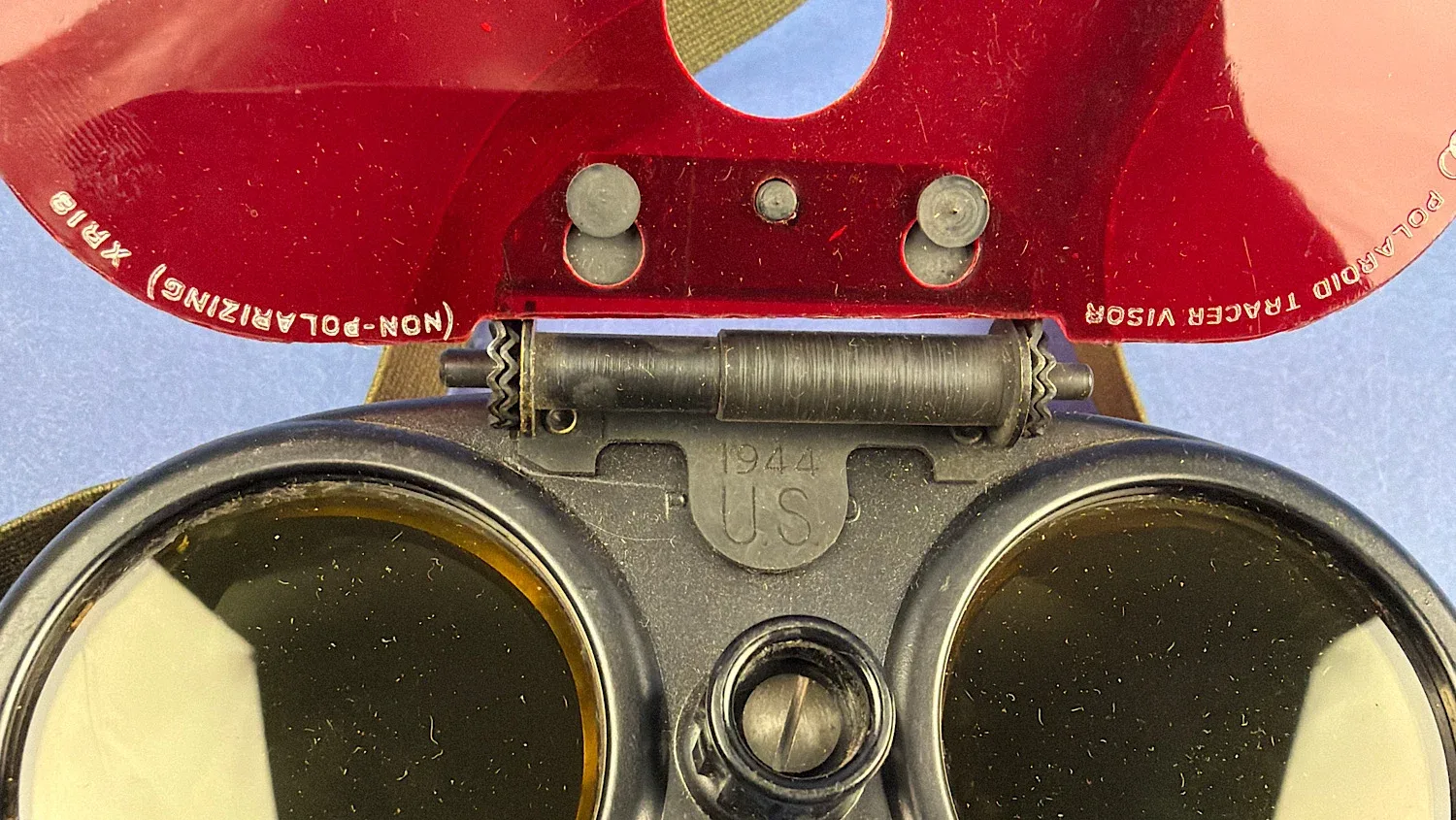The goggles retain their distinctive red Polaroid “Tracer Visor” attachment, marked as non-polarizing and correct to the period. The frame is clearly stamped “U.S.” and dated 1944, confirming wartime production. The elastic strap appears original and consistent with issue examples.