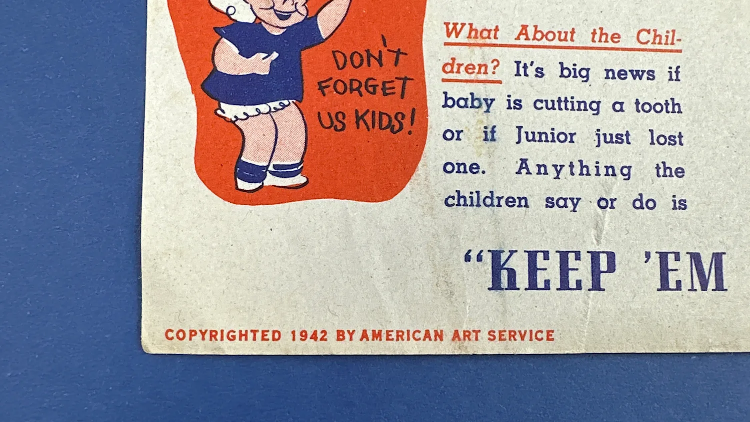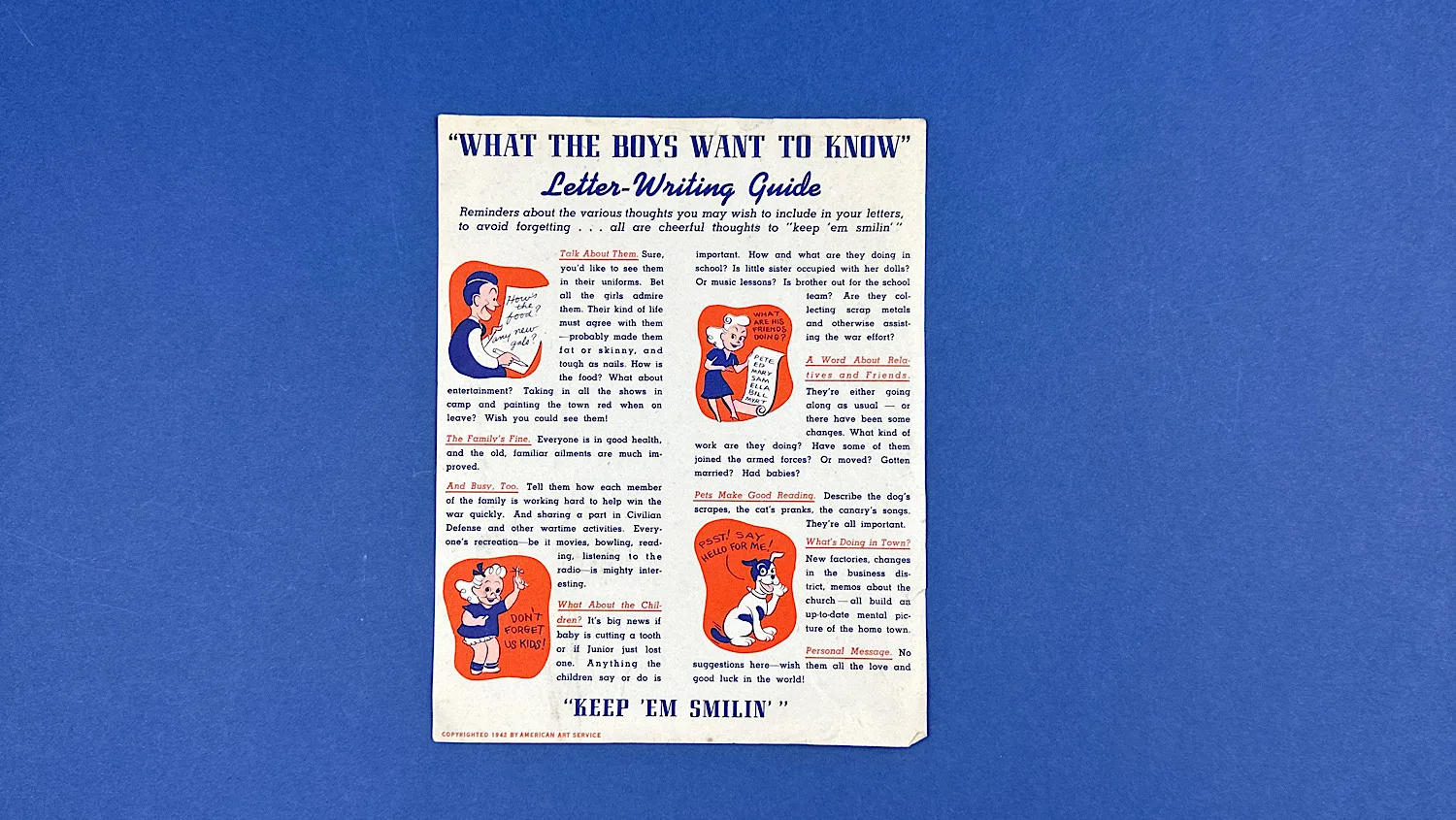 The set includes all original contents as specified on the packet: eight different illustrated cartoon envelopes, eight unused 4-page “Keep ’Em Smilin’” writing sheets, and the original “What the Boys Want to Know” letter-writing guide. The guide offers period advice to families on what subjects to include in letters to soldiers, making it one of the most historically interesting and often missing components of these sets. The original outer packet wrapper is also present and displays honest wartime handling wear, including opening tears and paper loss at both the top edge and the lower section where the packet was originally opened.