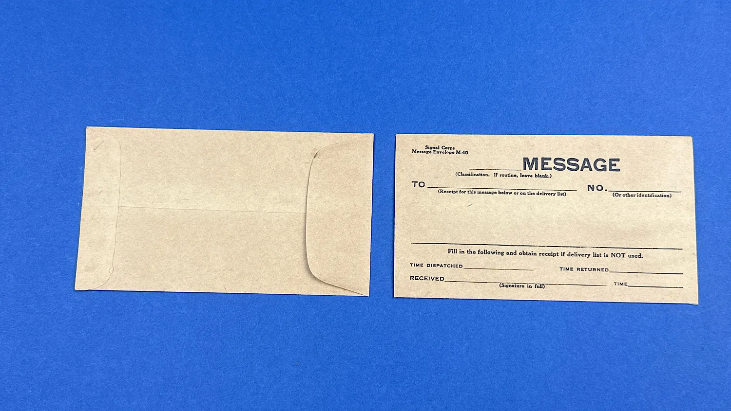We have also included two original US Army Signal Corps M-40 message envelopes. These are not part of the original “Keep ’Em Smilin’” packet contents, but they are contemporary wartime items and add useful contextual value to the group, illustrating the broader range of correspondence and communication material in use during the period.