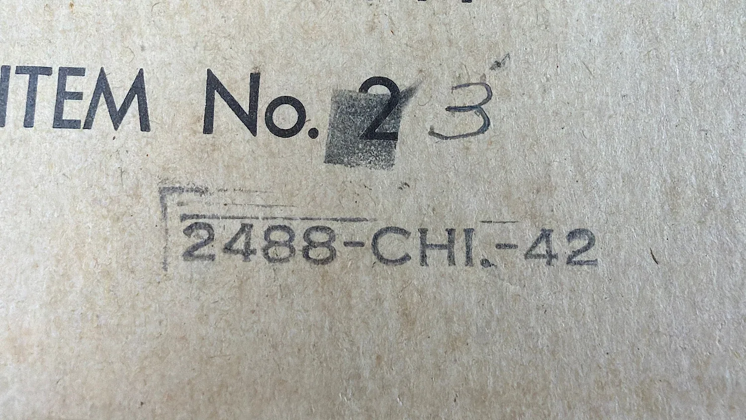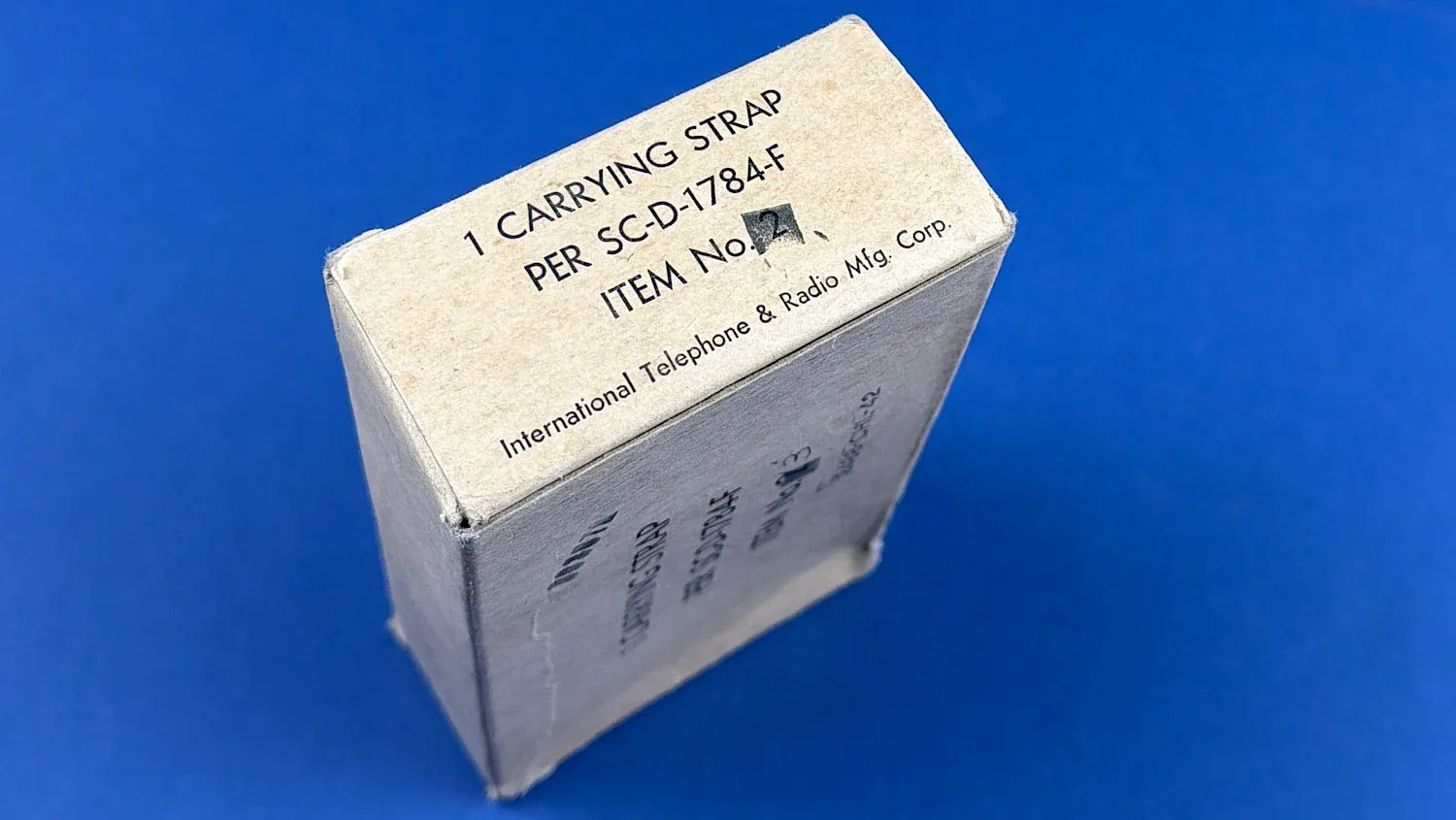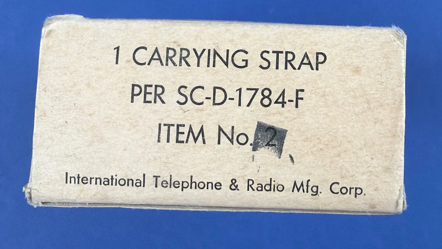 Manufactured under contract in Chicago and marked to specification SC-D-1784-F, this strap was produced for use with Signal Corps equipment such as field telephones, radios, and associated cases. The box is clearly printed “1 Carrying Strap” and bears the maker’s details for the International Telephone & Radio Mfg. Corp., a known wartime supplier of communications equipment to the U.S. Army. The additional contract marking “2488-CHI-42” confirms Chicago procurement and 1942 production.